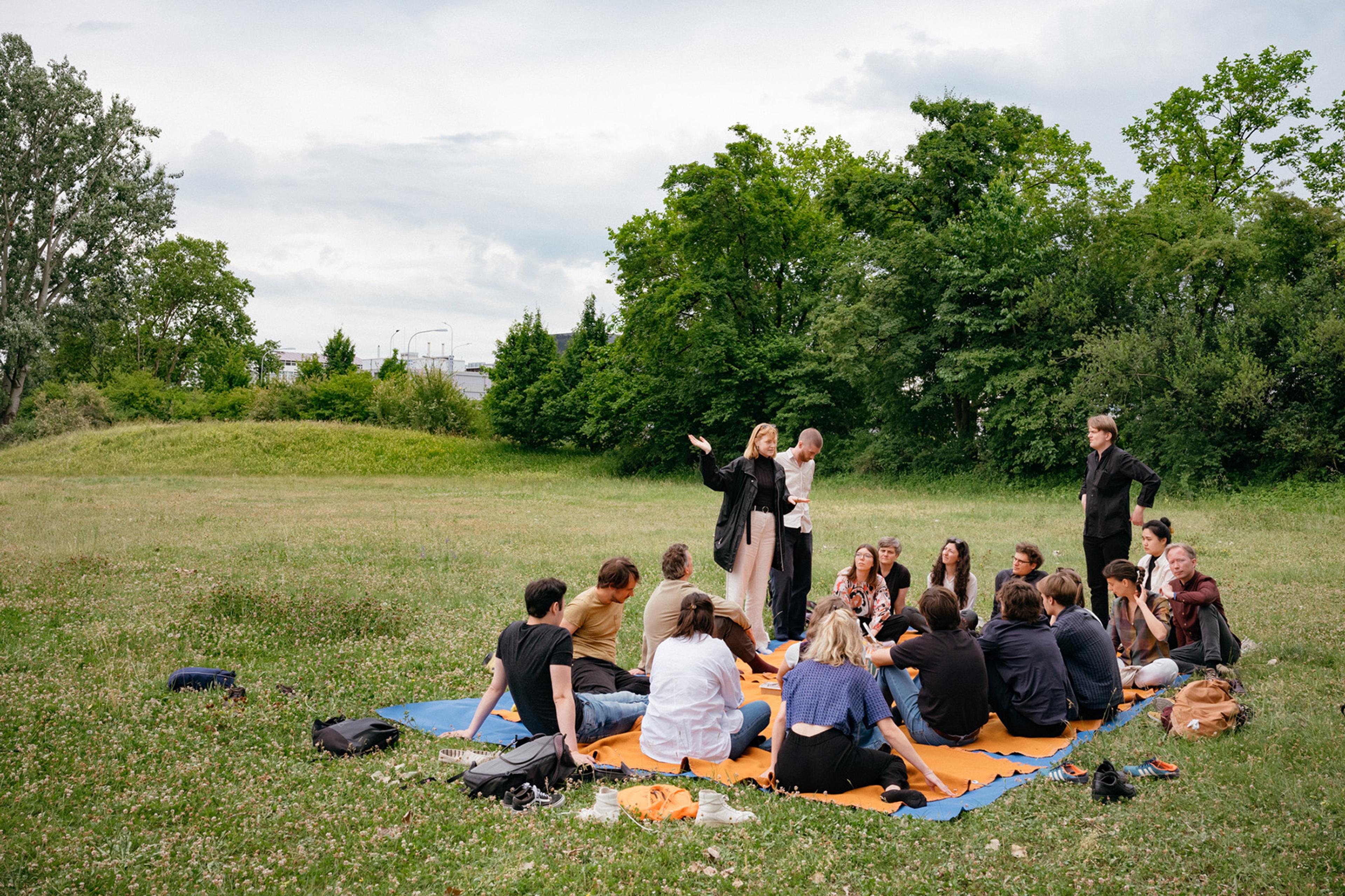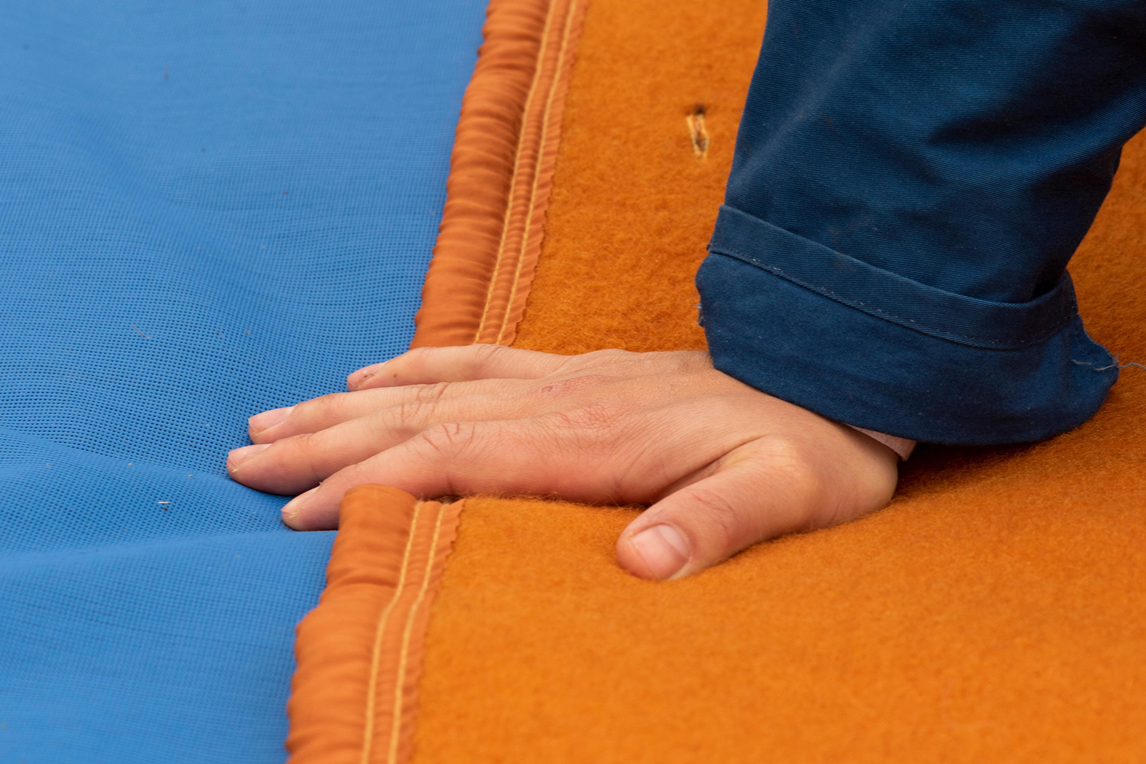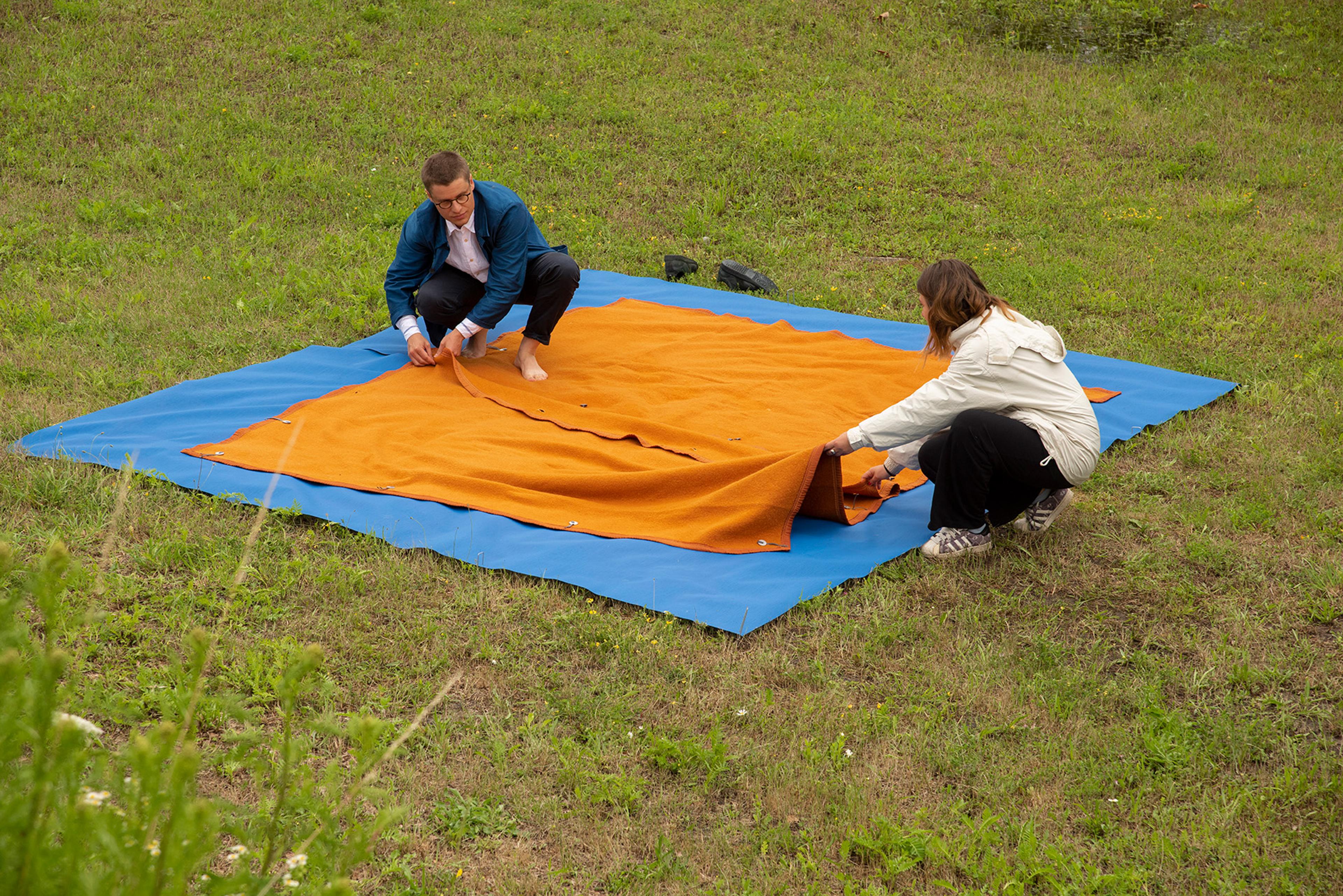 The blankets are made of two layers: a highly durable and resilient high-tenacity polyester mesh in deep blue, combined with two orange woolen blankets (220 × 180 cm) originally sourced from the French army. Specially designed eyelets and ribbons hold these layers together, forming a total surface area of approximately six square meters. This versatile fabric composition can be spread out indoors or outdoors and secured to the ground using metal rings and pegs. With its soft, warming surface and contrasting colors, the blanket becomes a distinct spatial element – an invitation to gather, connect, embrace physical, even intimacy. It encourages a shift in posture, offering a welcome departure from the rigidity of everyday seating. Whether sitting cross-legged, stretching out, or lying on one’s stomach, users negotiate space organically, adjusting and adapting to one another rather than conforming to fixed arrangements like individual chairs or tables. Even the act of spreading out the blanket requires dialogue and a shared decision. In this way, the blanket transforms any setting – no matter how harsh or unexpected – into a place of togetherness, a refuge, a cozy retreat.