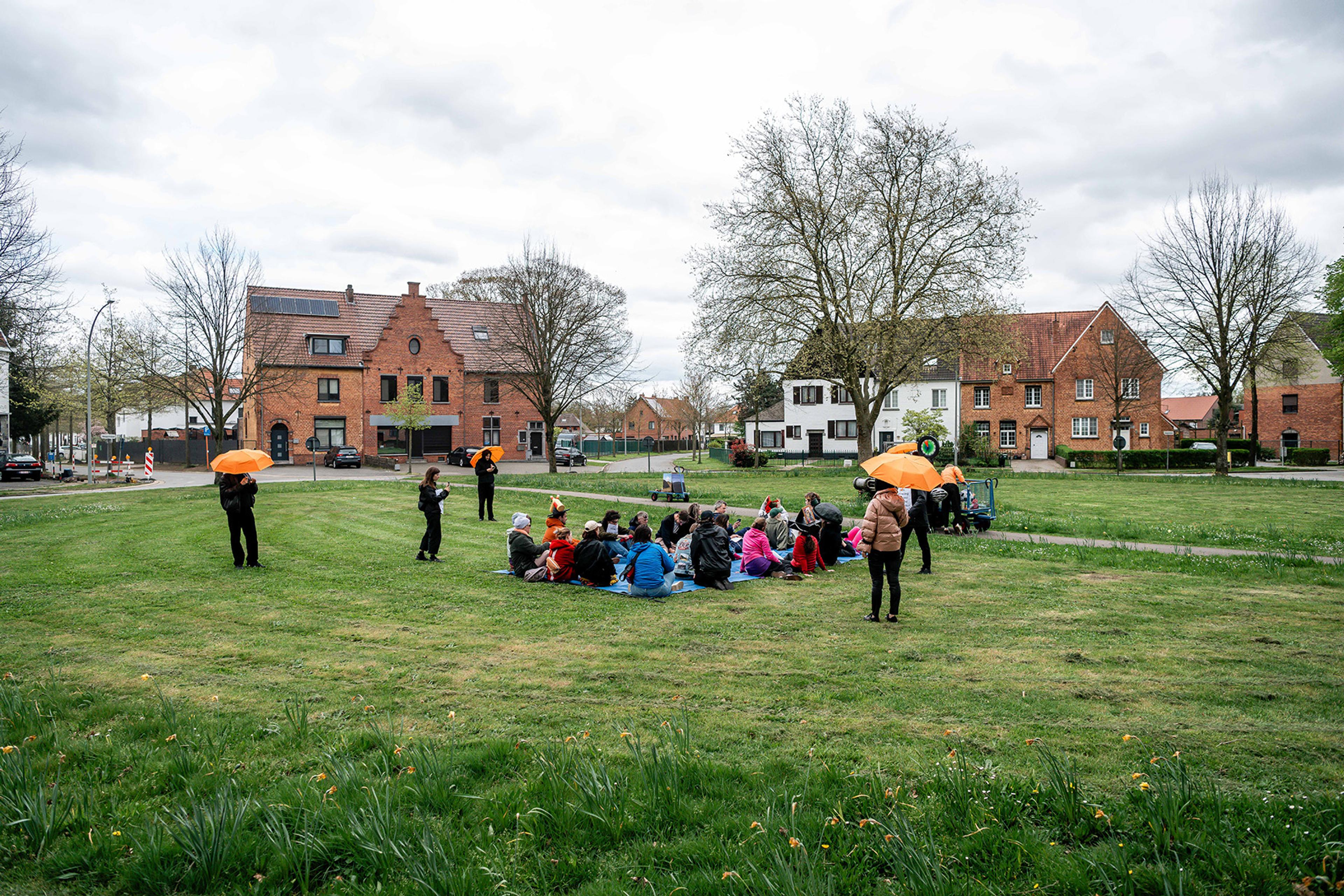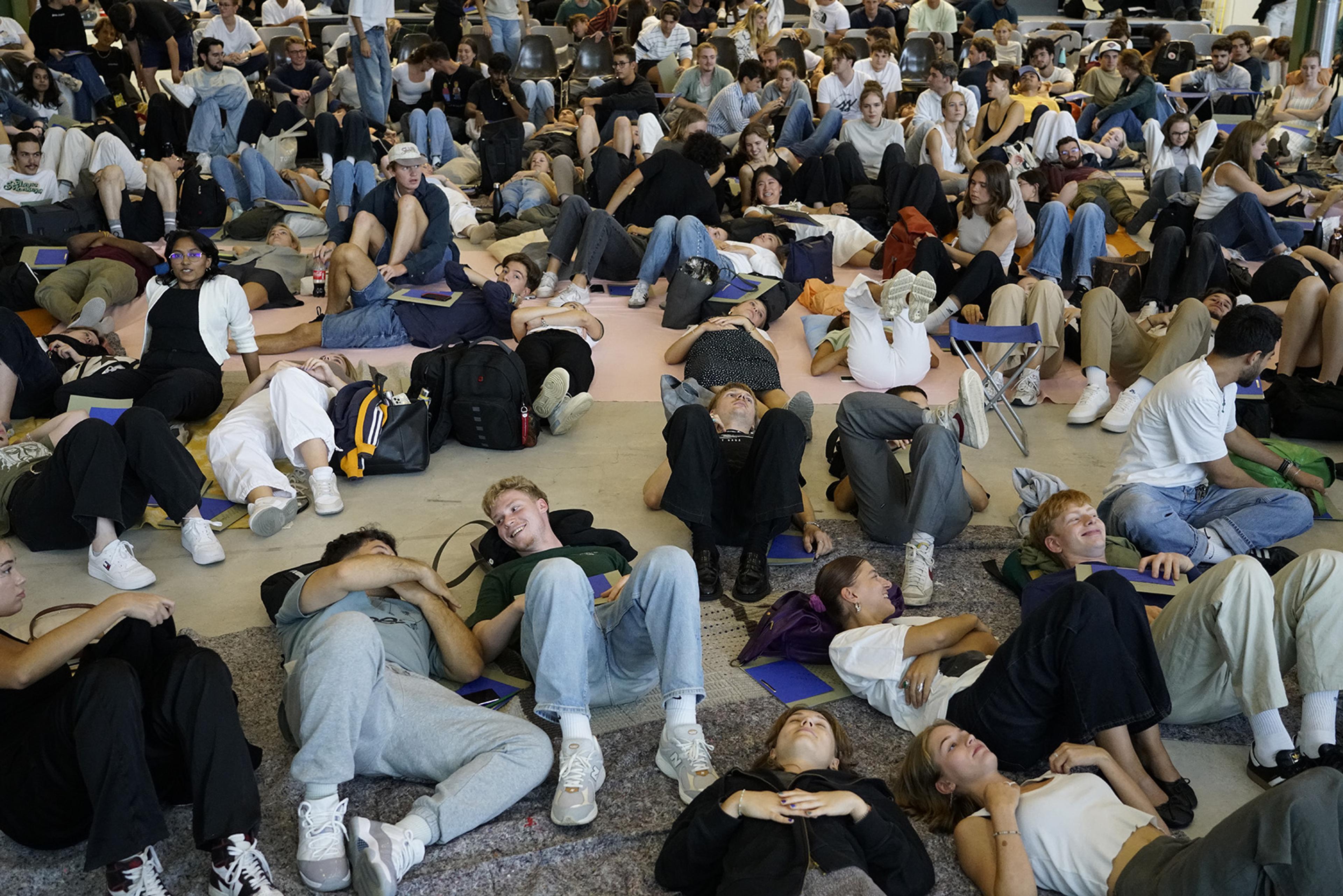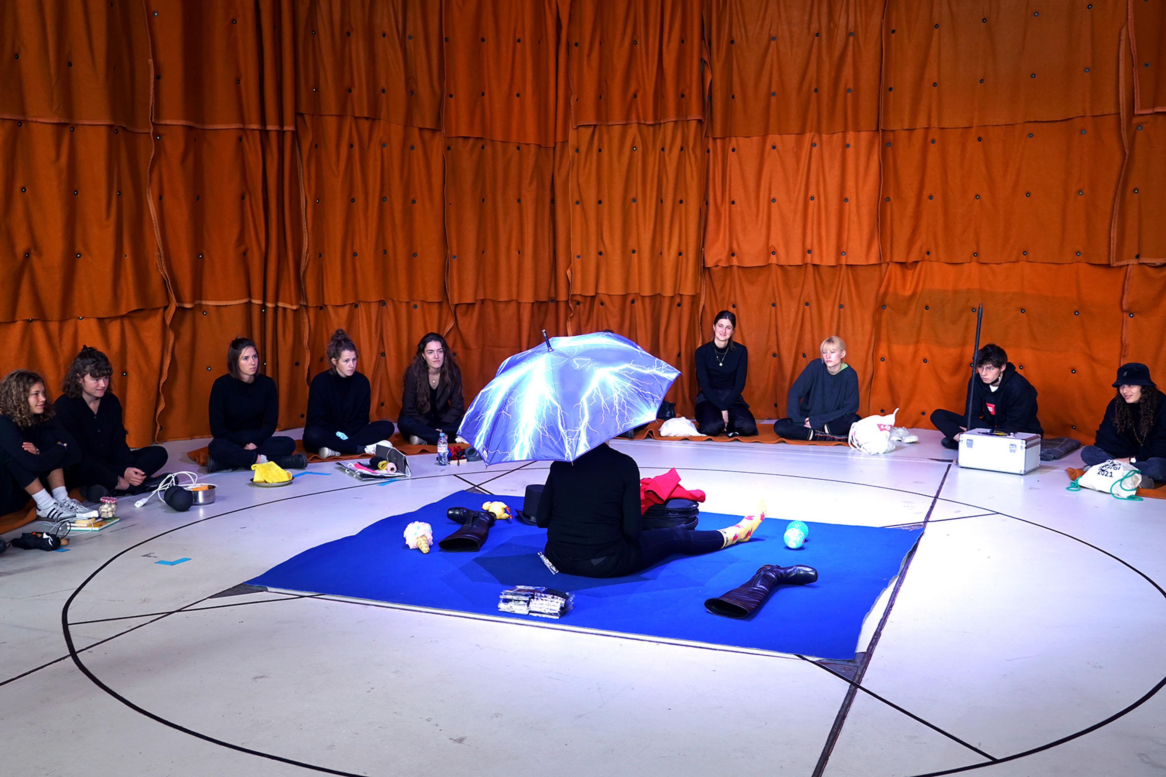 The blankets are made of two layers: a highly durable and resilient high-tenacity polyester mesh in deep blue, combined with two orange woolen blankets (220 × 180 cm) originally sourced from the French army. Specially designed eyelets and ribbons hold these layers together, forming a total surface area of approximately six square meters. This versatile fabric composition can be spread out indoors or outdoors and secured to the ground using metal rings and pegs. With its soft, warming surface and contrasting colors, the blanket becomes a distinct spatial element – an invitation to gather, connect, embrace physical, even intimacy. It encourages a shift in posture, offering a welcome departure from the rigidity of everyday seating. Whether sitting cross-legged, stretching out, or lying on one’s stomach, users negotiate space organically, adjusting and adapting to one another rather than conforming to fixed arrangements like individual chairs or tables. Even the act of spreading out the blanket requires dialogue and a shared decision. In this way, the blanket transforms any setting – no matter how harsh or unexpected – into a place of togetherness, a refuge, a cozy retreat.