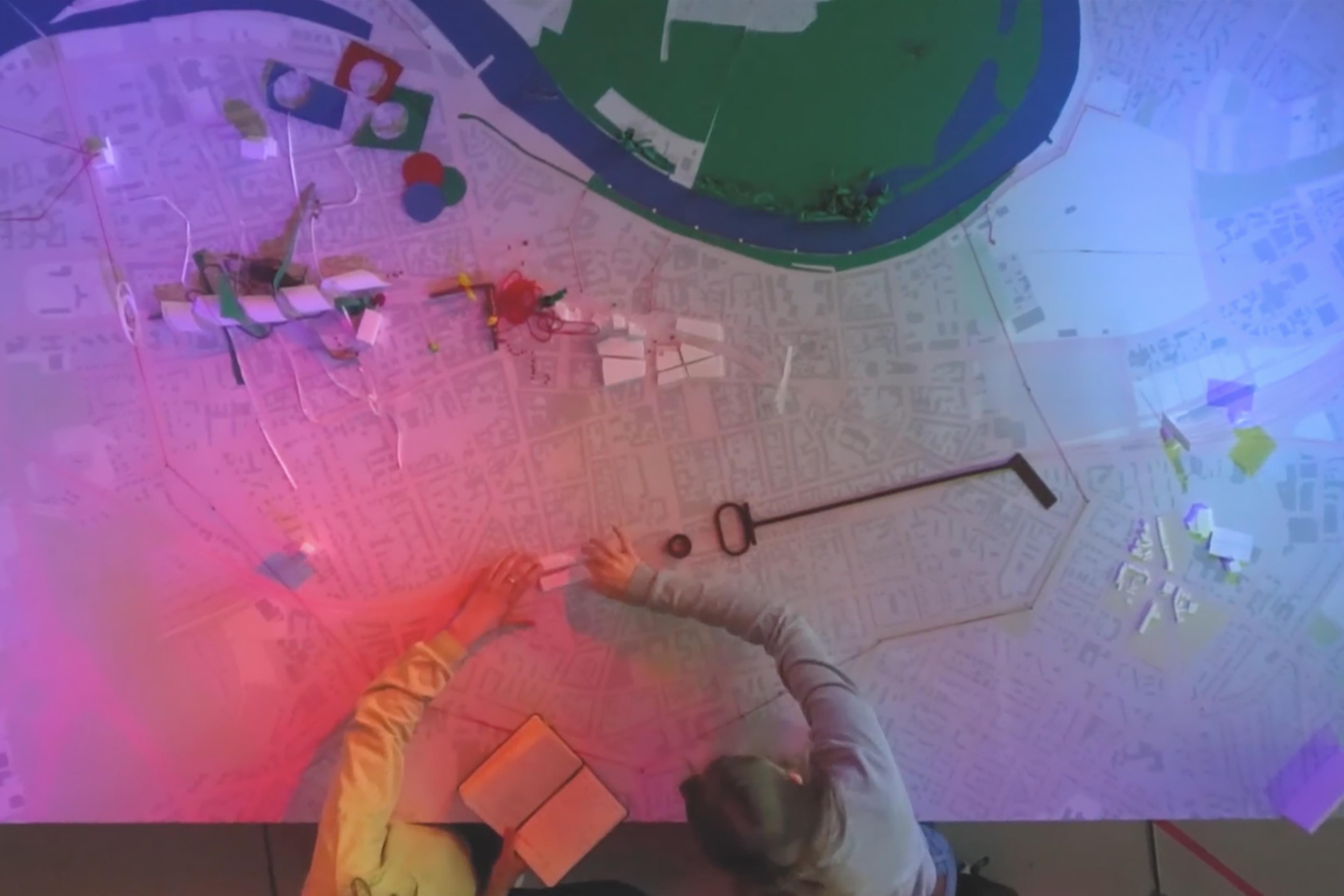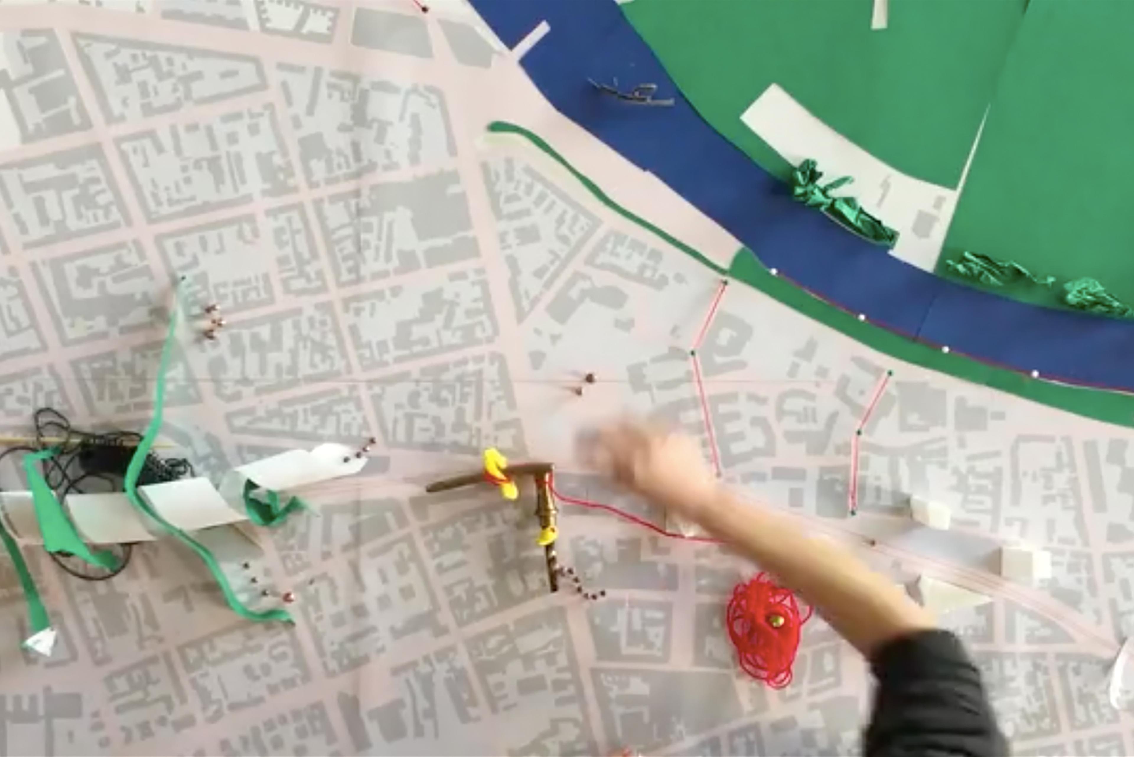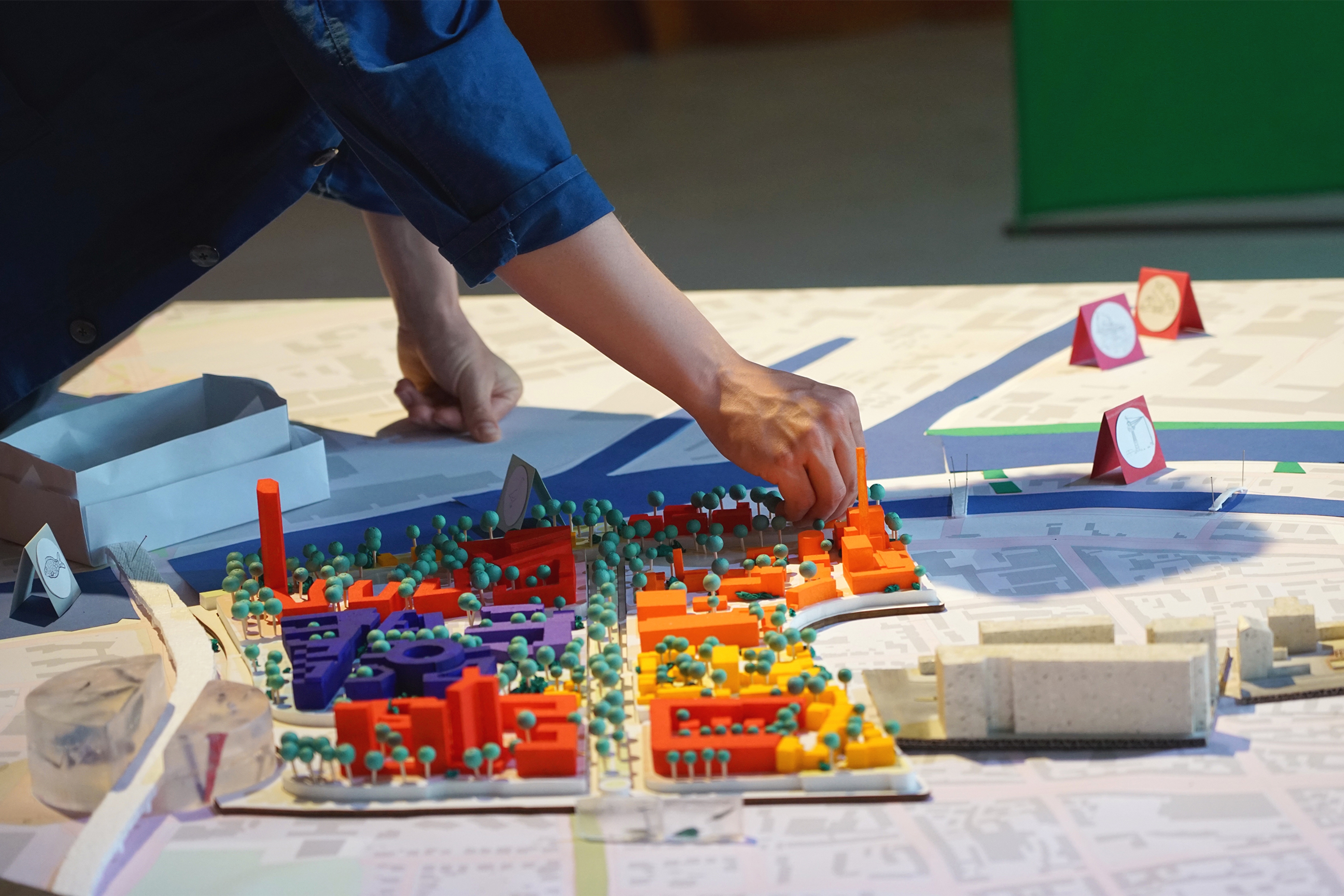 In the context of our NEWROPE Studio Offenbach we introduced a collective model of possible interventions. This 1:1500 scale model shows a large part of the city of Offenbach, with its three main infrastructures: the river, the Berliner Straße, and the railways. The model brings together various interventions, which were developed by the students together with experts and residents of Offenbach. The brightly colored three-dimensional interventions in the form of miniature buildings and vegetation contrasted sharply with the printed map that served as the basis for the mode, making visible the ‘blind spots’ that have remained untouched.
