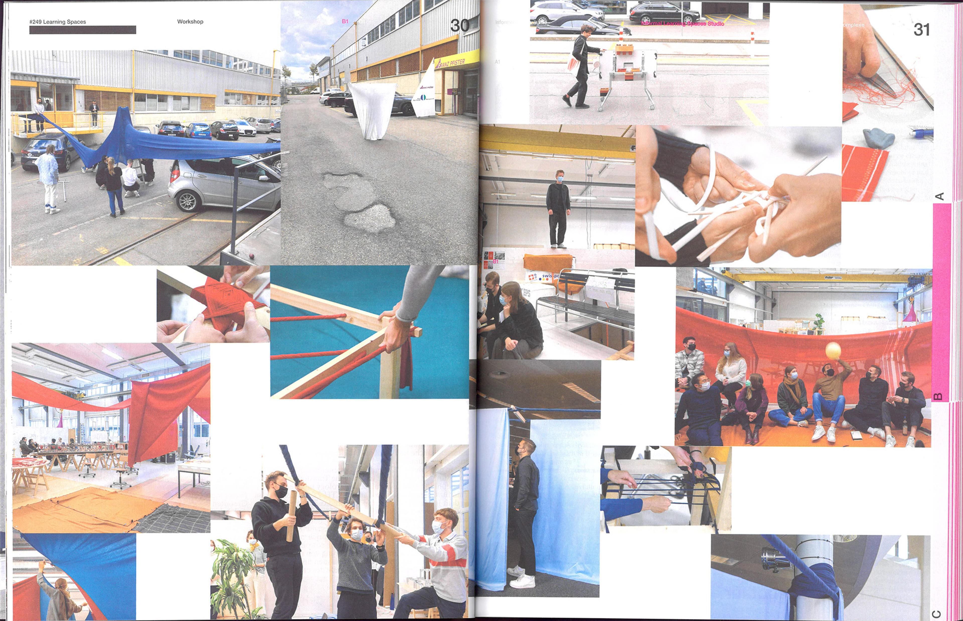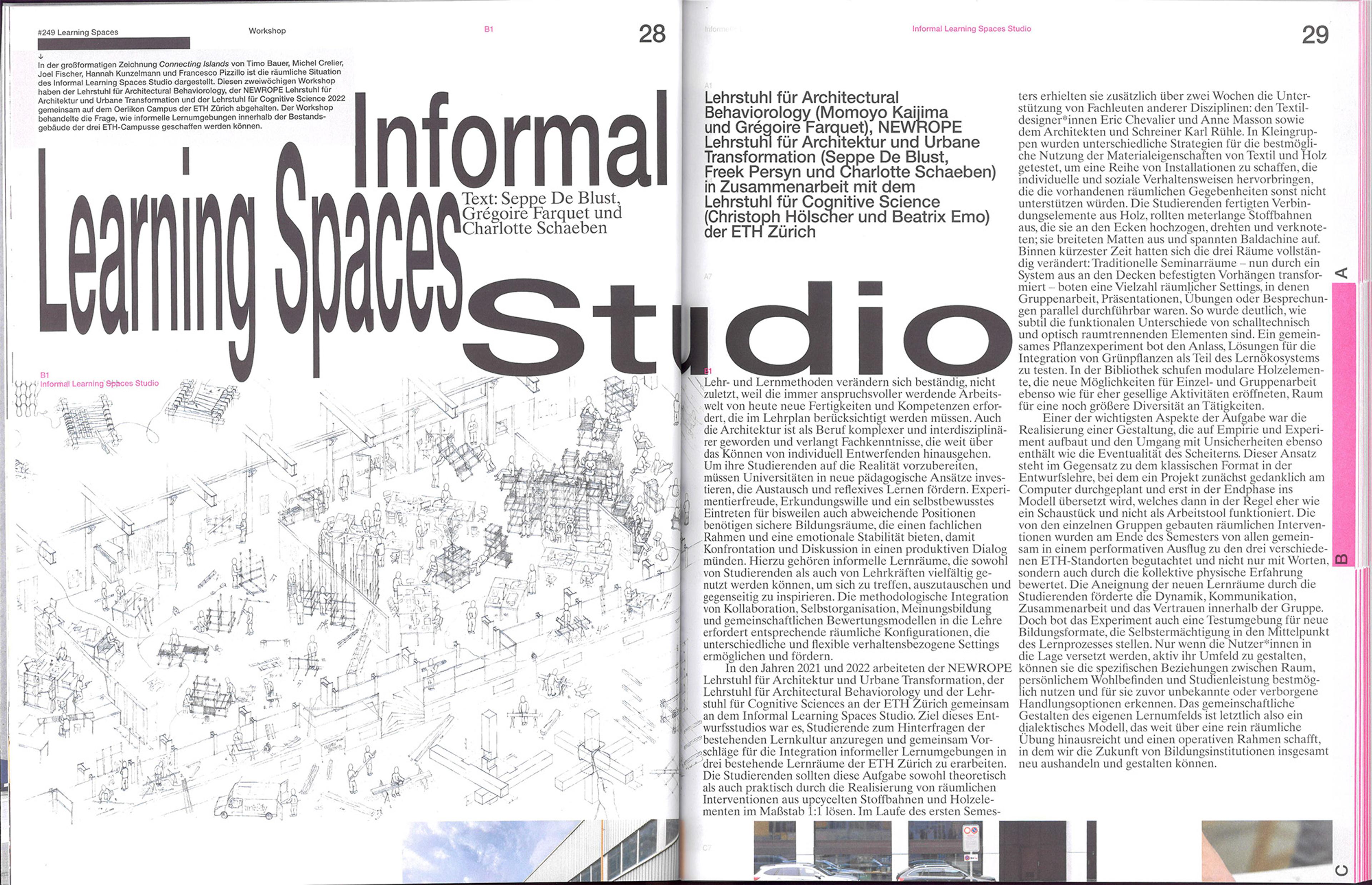 As educational methods evolve to meet the demands of an increasingly complex professional landscape, architecture too must adapt, requiring skills that extend beyond individual design expertise to include interdisciplinary insights instead. Universities, therefore, must invest in learning environments that foster open exchange and reflexive, hands-on exploration. In issue 249 of ARCH+ on Learning Spaces Seppe De Blust, Grégoire Farquet and Charlotte Schaeben talk on the Informal Learning Spaces Studio at ETH Zurich – a collaboration between NEWROPE, the Chair of Architectural Behaviorology, and the Cognitive Sciences Chair – over the course of two semesters encouraged students to challenge traditional learning cultures and engage in physical spatial interventions. Through crafting upcycled installations from fabric and wood, students experimented with creating flexible, adaptive settings that support both individual and social behaviors, transforming existing spaces into multifunctional learning environments.
