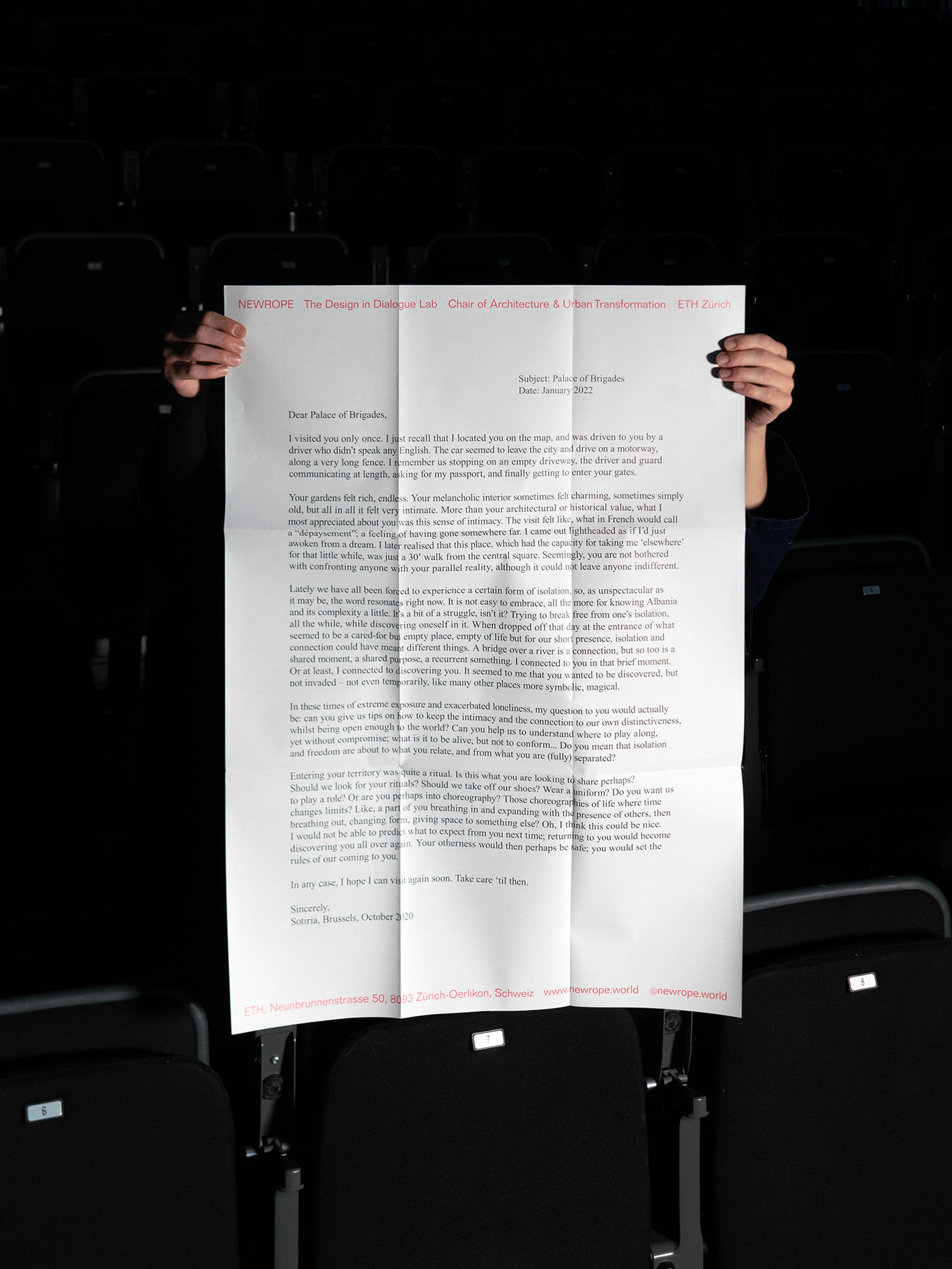 Motivated by the works and ideas of the students of Studio Tirana, Sotiria Kornaropoulou addressed this letter to the Palace of Brigades in Tirana in 2020, recounting her only visit and the profound impressions it left on her