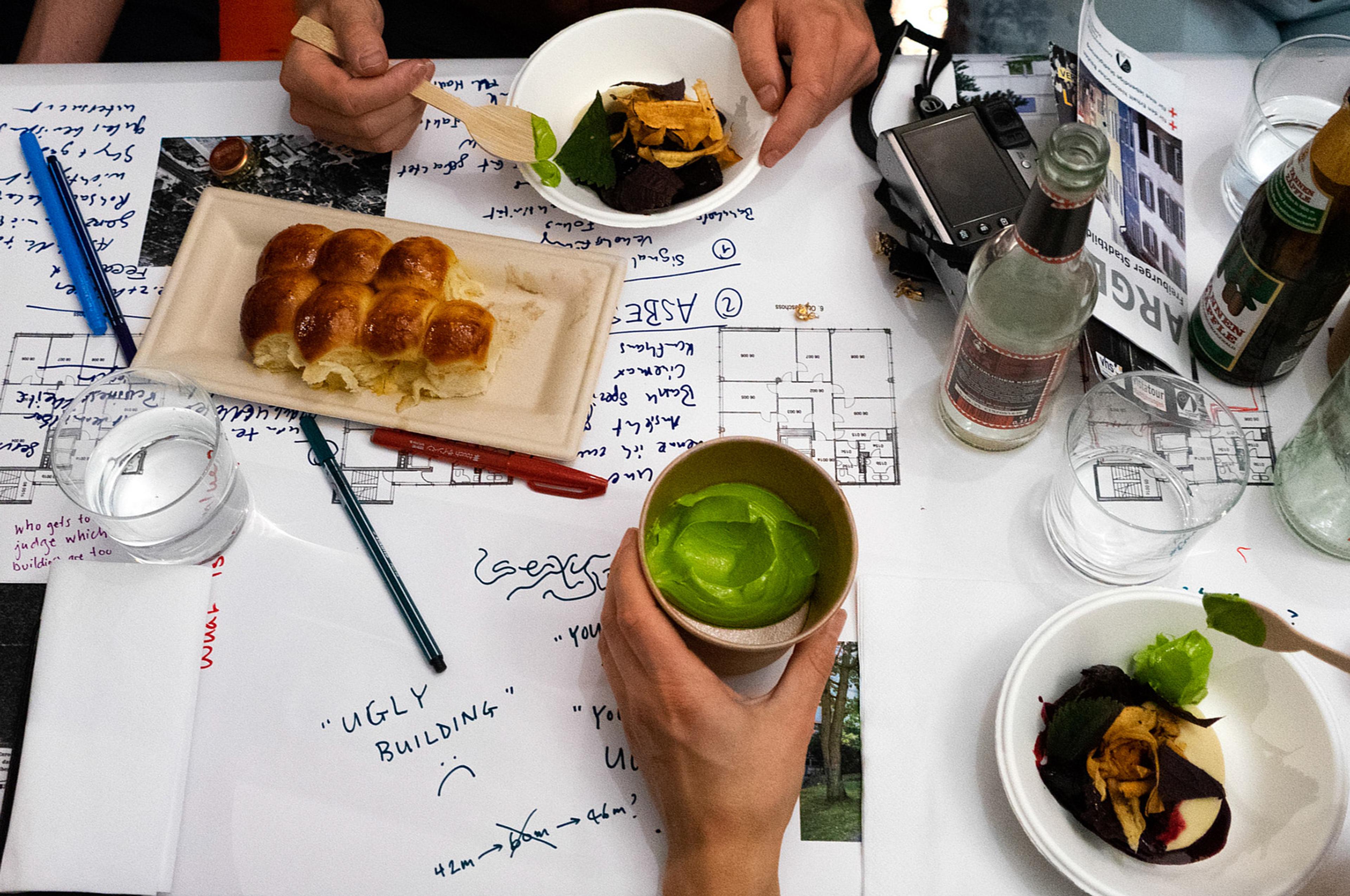 During the evenings we collectively shared our meals in order to digest the impressions collected. These evenings were also test situations to design informal exchange. Our trip culminated in a performative dinner with local stakeholders in Freiburg, tackling the transformation process of the “Europaviertel” – a moment that both, generously invited and critically challenged everyone involved.