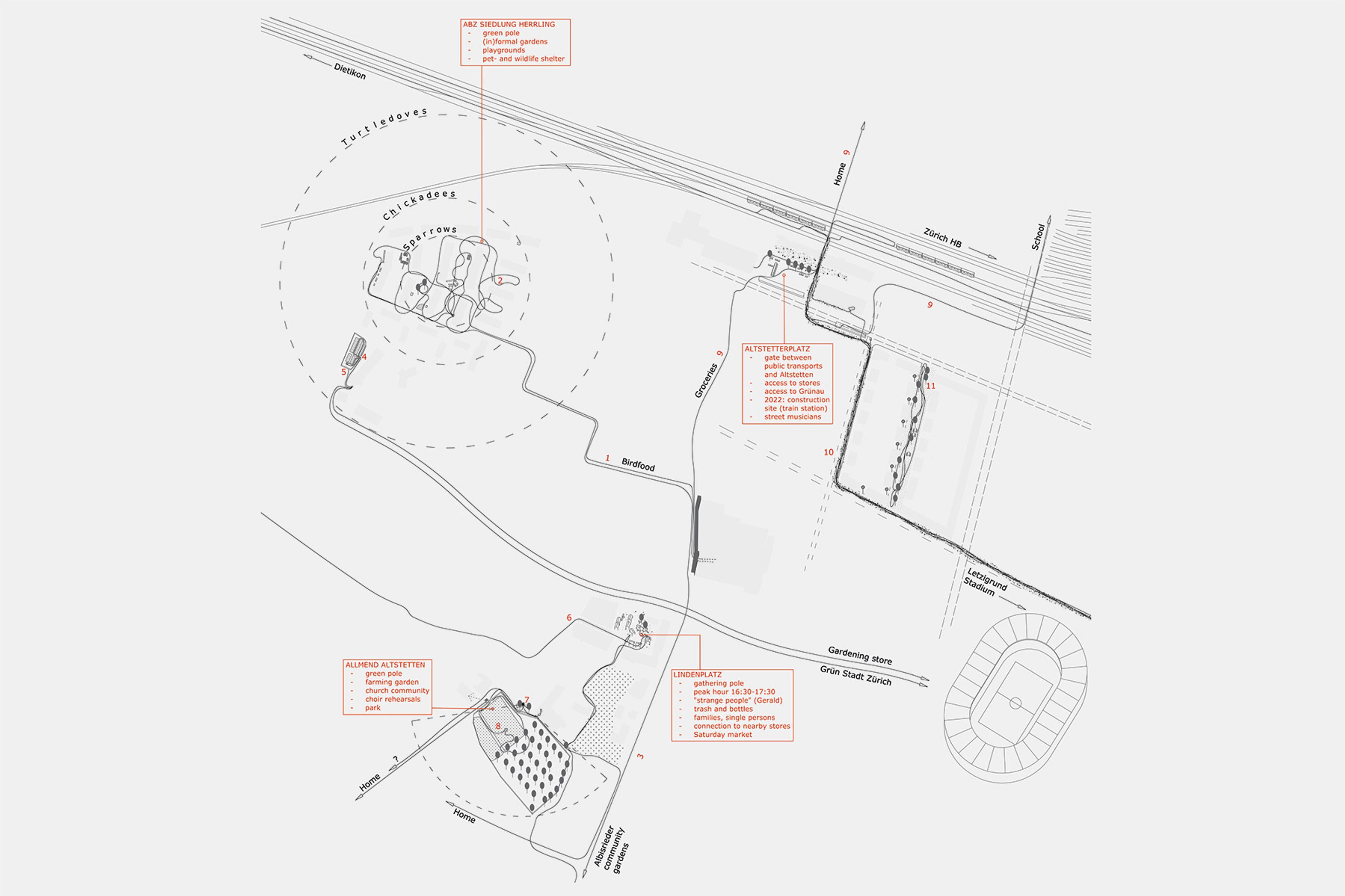 The whole studio was structured around four different “Design in Dialogue Sessions”. For each of these sessions we invited another group of people – architects, developers, the city administration of Zürich, citizens, gardeners and activists engaged in Altstetten – to become part of the Room of Entanglements. They became rather active contributors than visiting “critics” or experts. Together we tried to find ways to represent and engage with the complexity of this district under transformation.