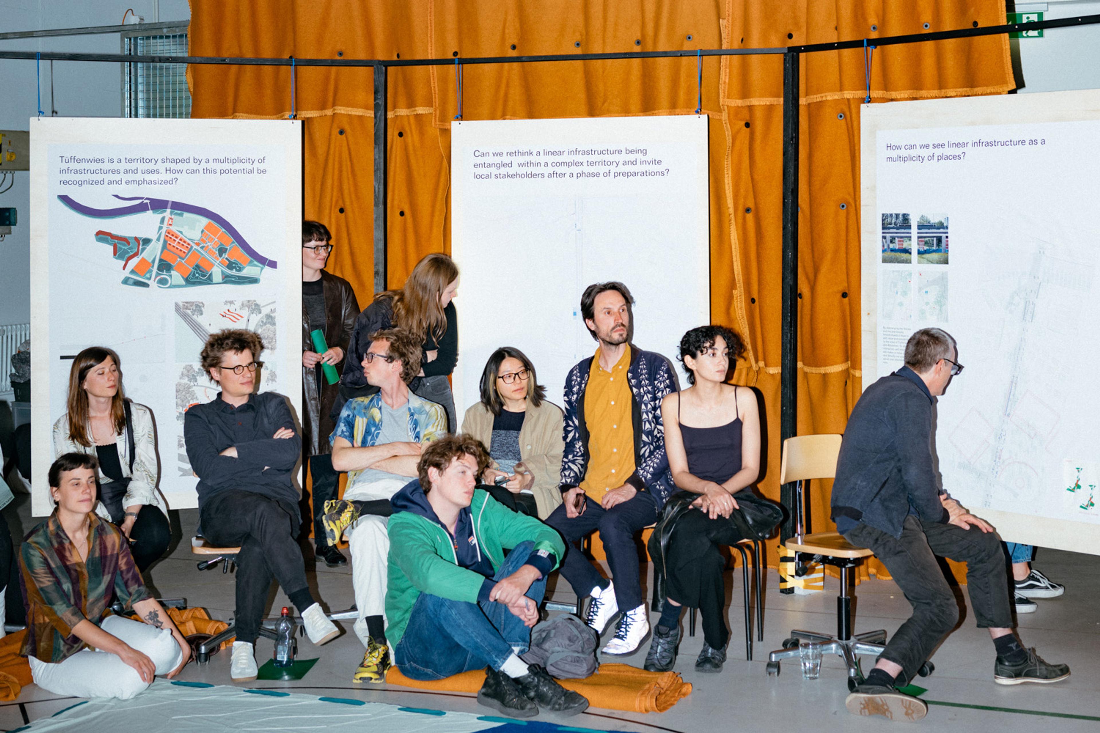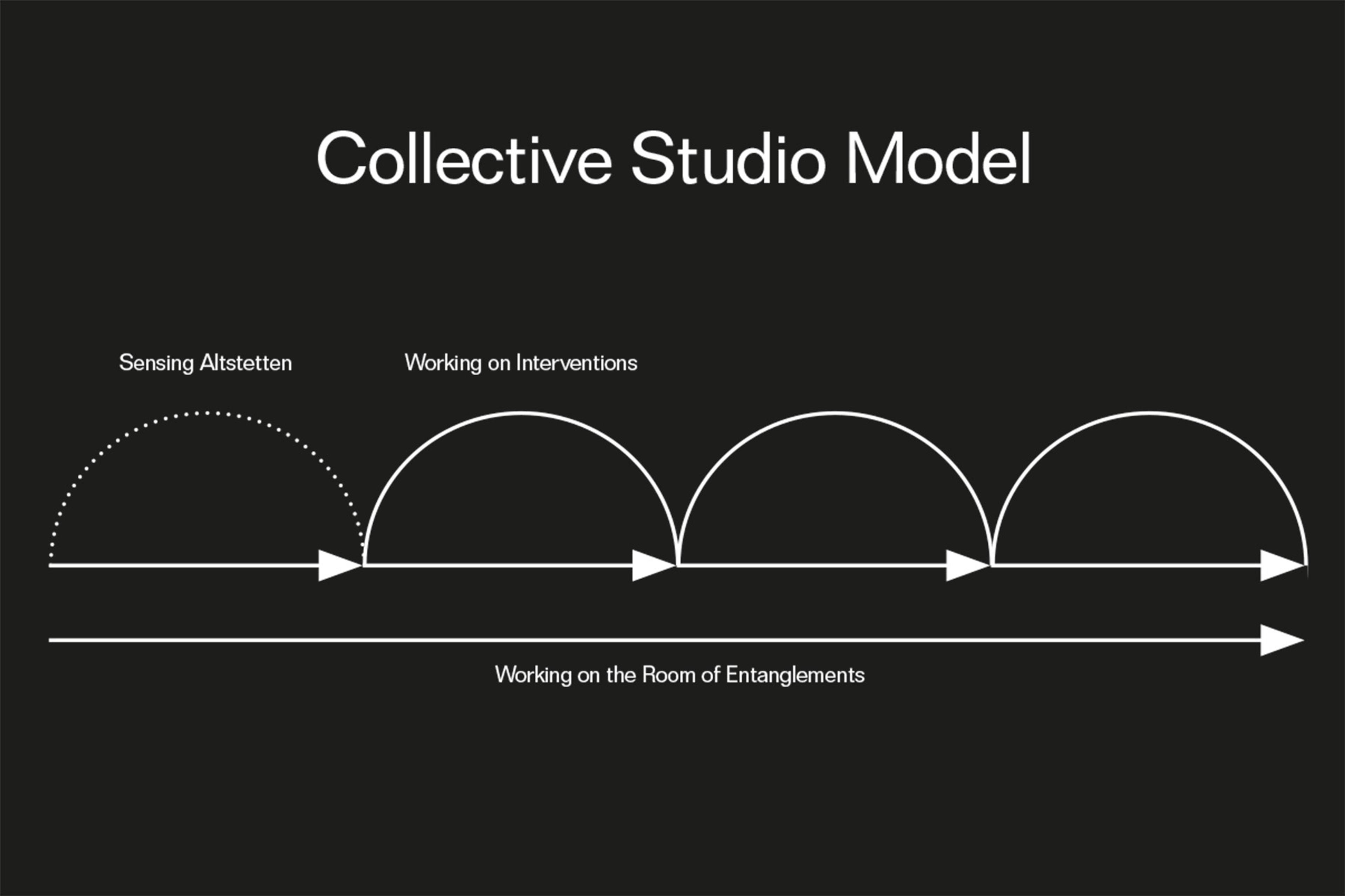 During the semester students took up several roles. In groups of 1-4 they worked on readings and interventions, responding to an ongoing densification project in Altsteten. In parallel each student took up different responsibilities for the collective studio – such as designing or building the “Room of Entanglements”, archiving and structuring the studio output, writing the script for the collective presentation, or coordinating the collective cooking during studio days.