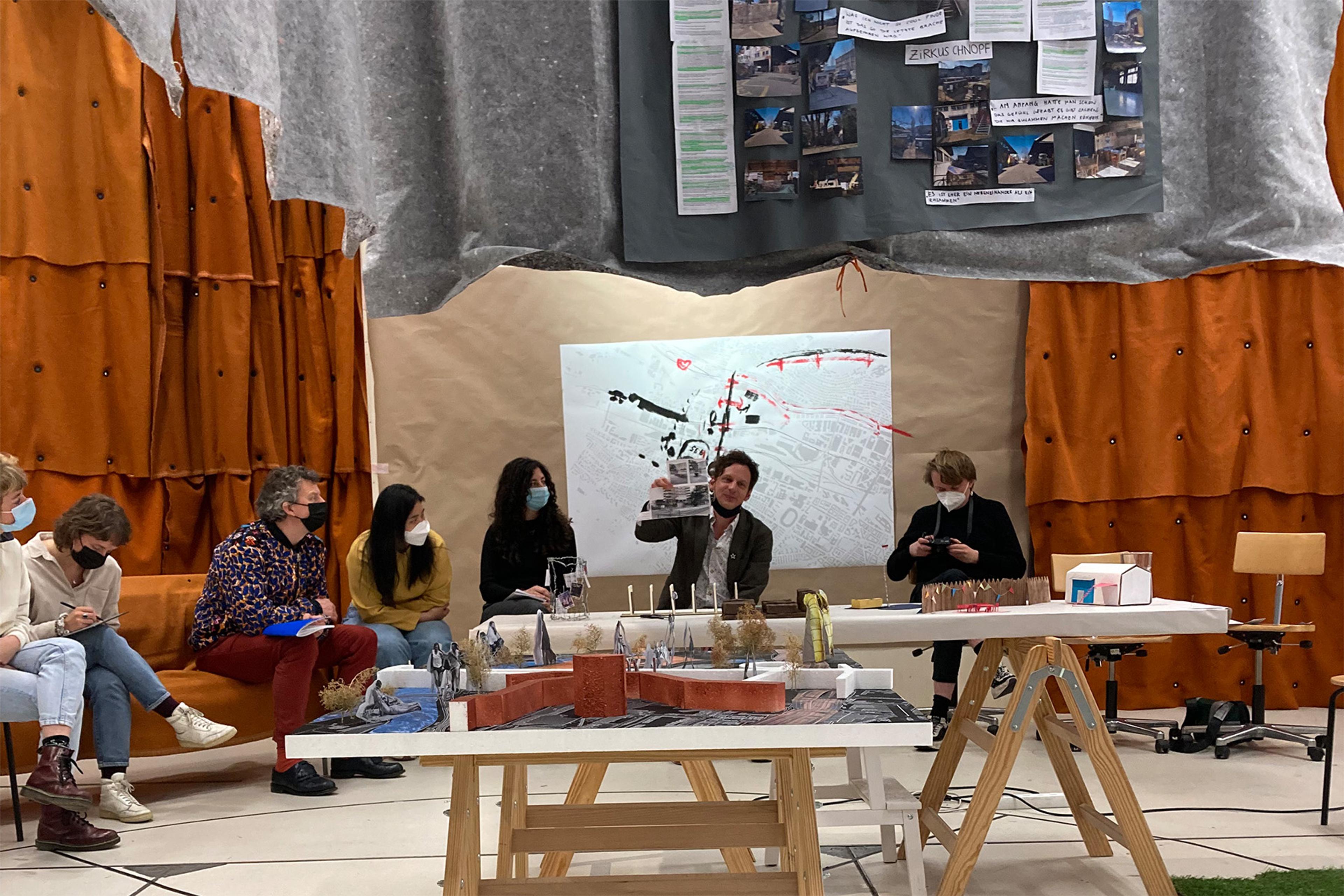 In the centre of the studio was, what we called, a “Room of Entanglements”: A scenographic environment, constructed out of all studio work, as an inviting and inspiring space to help us – students and stakeholders involved in urban transformation – to transgress current ways of thinking. As an immersive spatial setup this room should encourage to think beyond the plot, to think in relations, to think in long(er) time spans, and to reconnect with the actual lives of people living and working in the area.