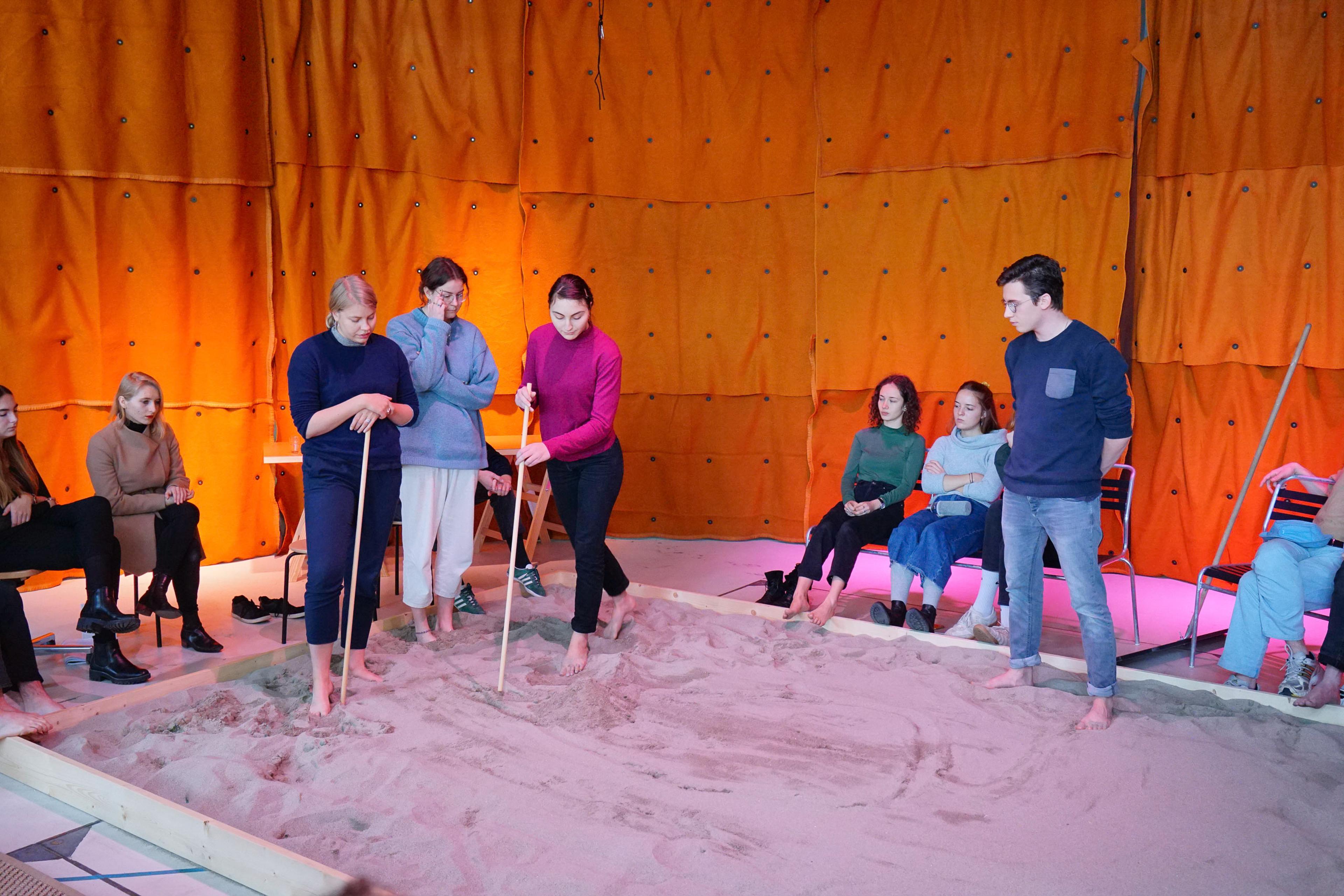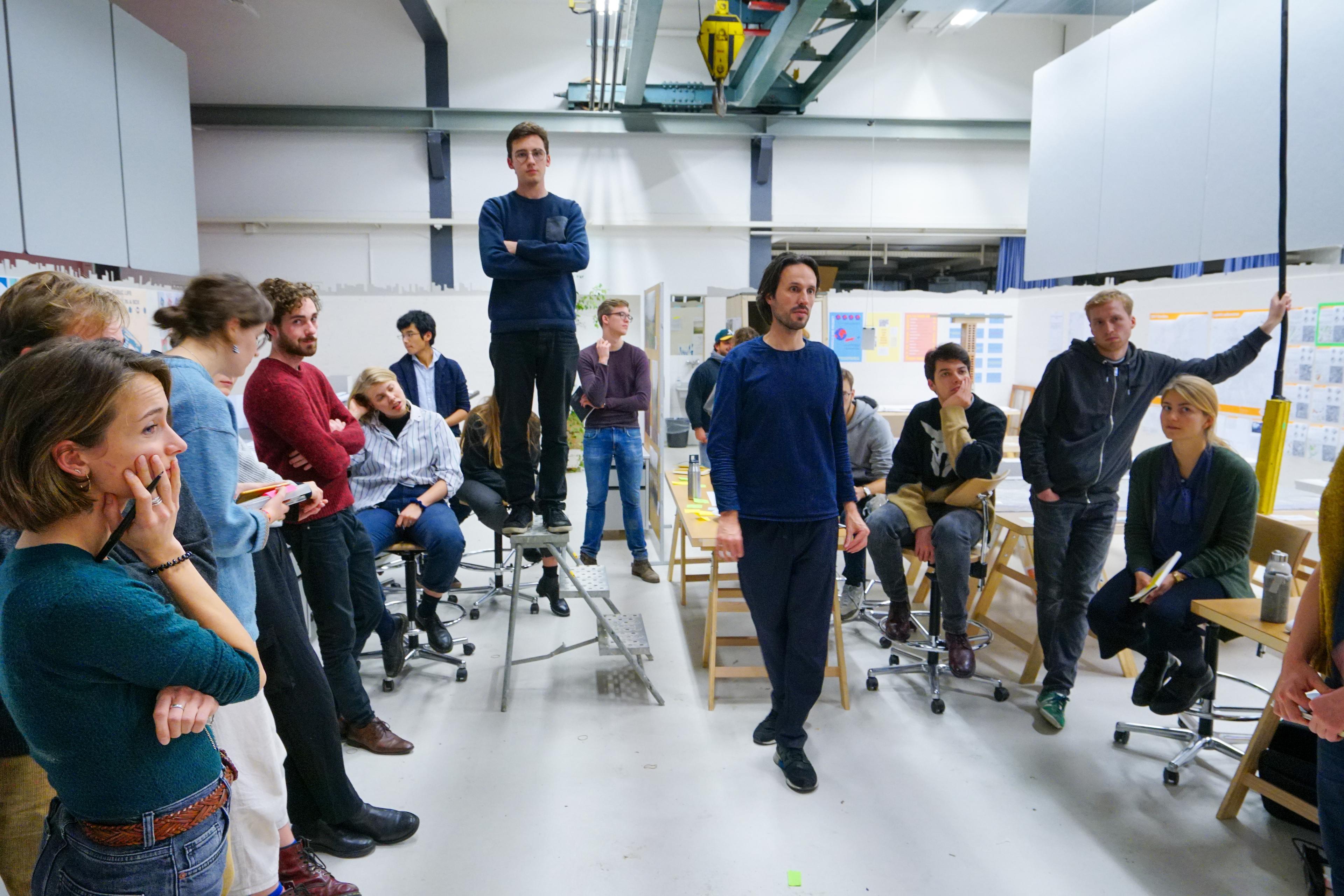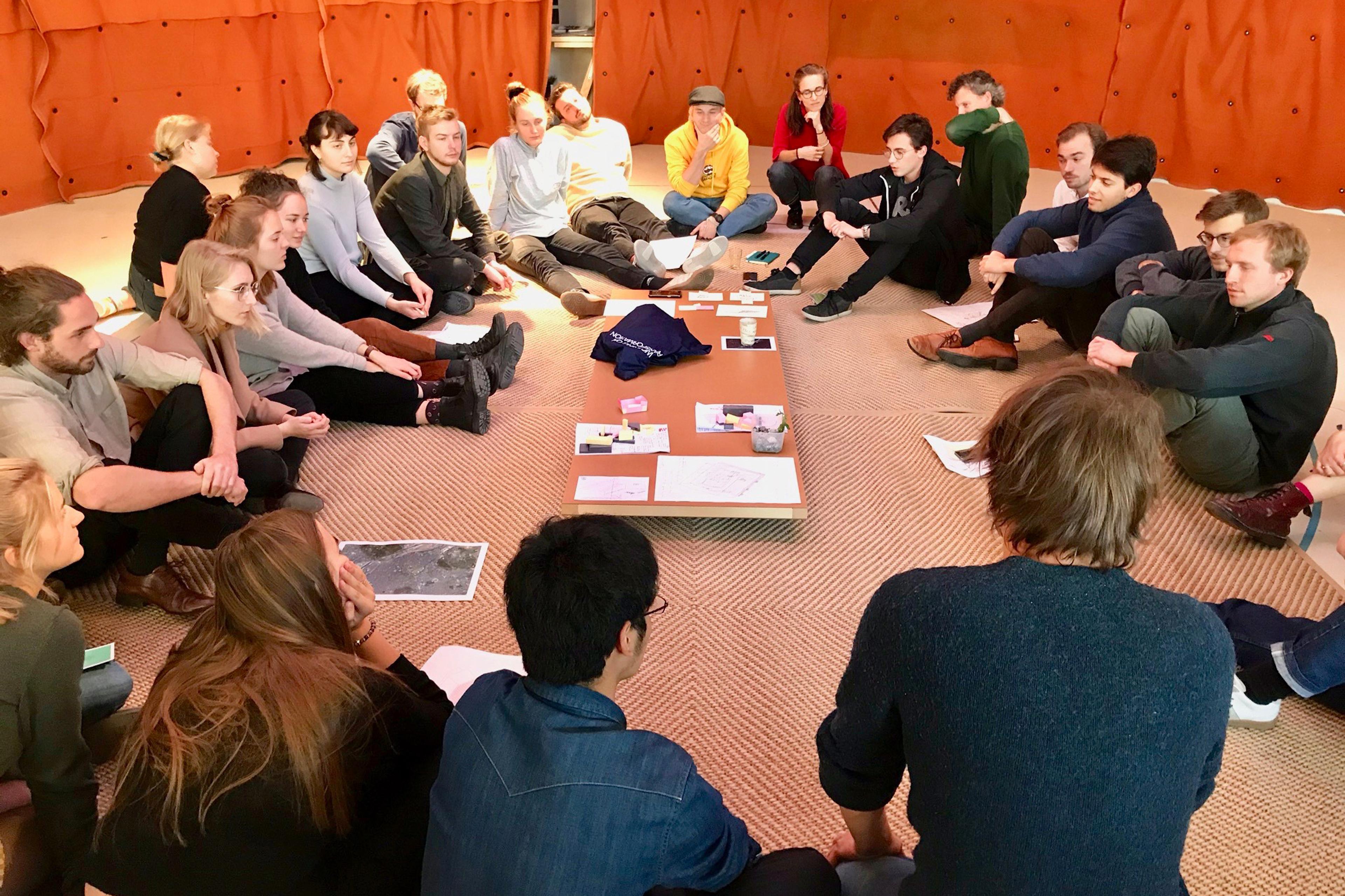 During the first weeks students get to know the context, position themselves and develop their own topic. During the second cycle, students design their own workshops as experimental co-creative moments, where they involve fellow students, outsiders and teachers in the development of their project. The third cycle focuses on cross connections between projects in order to strengthen the collective output and work towards the final presentation. During the “Design in Dialogue Session” the Sandbox serves as a format for playful interactions, it helps to discuss the projects again on an abstract level and to strengthen the studio’s main narrative and thematic threads. Besides, it becomes a stage for exchange between students, experts from Brussels and Zurich. For this session we were joined by a group of stakeholders, involved in urban transformation, from Zurich (RZU) and Brussels (B MA). Next to the studio visit they met in Zurich for a cross organizational dialogue on transformation policies.