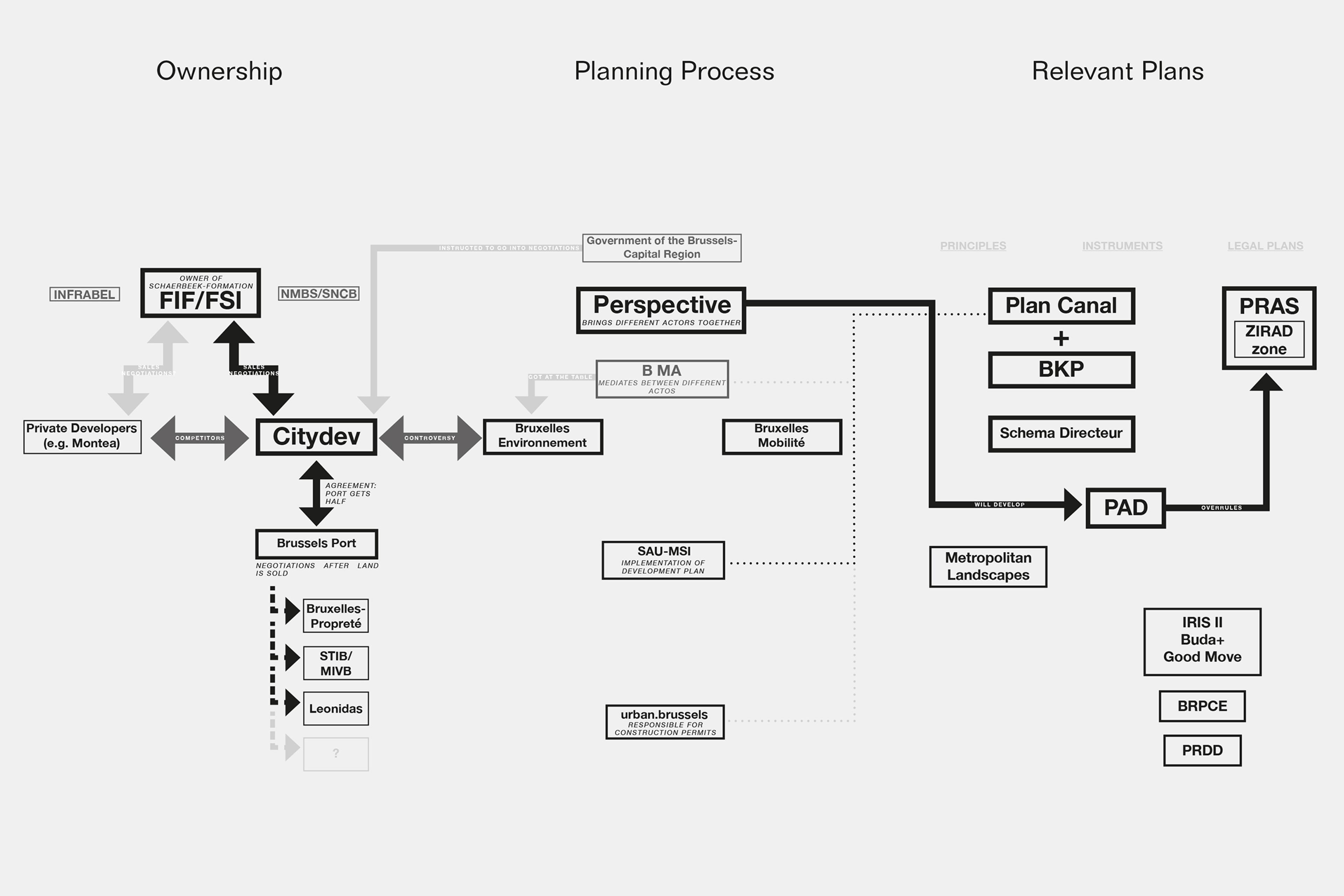 The site our exploration and engagement starts from – Schaerbeek-Formation – is one of the last big empty pieces of land in Brussels. It lies in the north of Brussel-Capital Region and thus close to the border with Flanders. It sits between a great variety of different urban patterns and infrastructures: Between the Port and the railway, in close proximity to the Airport, to different industrial areas, large green spaces, lively neighborhoods and the suburbs of Flanders. The multimodality – the accumulation of different modes of transport – is a great potential of the site. Besides it is one of the last big pieces of land with a link between water, road and railway. It is as well internationally connected as in close proximity to the city center. This situation makes it a site with a large potential for productive activities and therefore creates a complex situation with many stakeholders involved and sometimes conflicting interests.