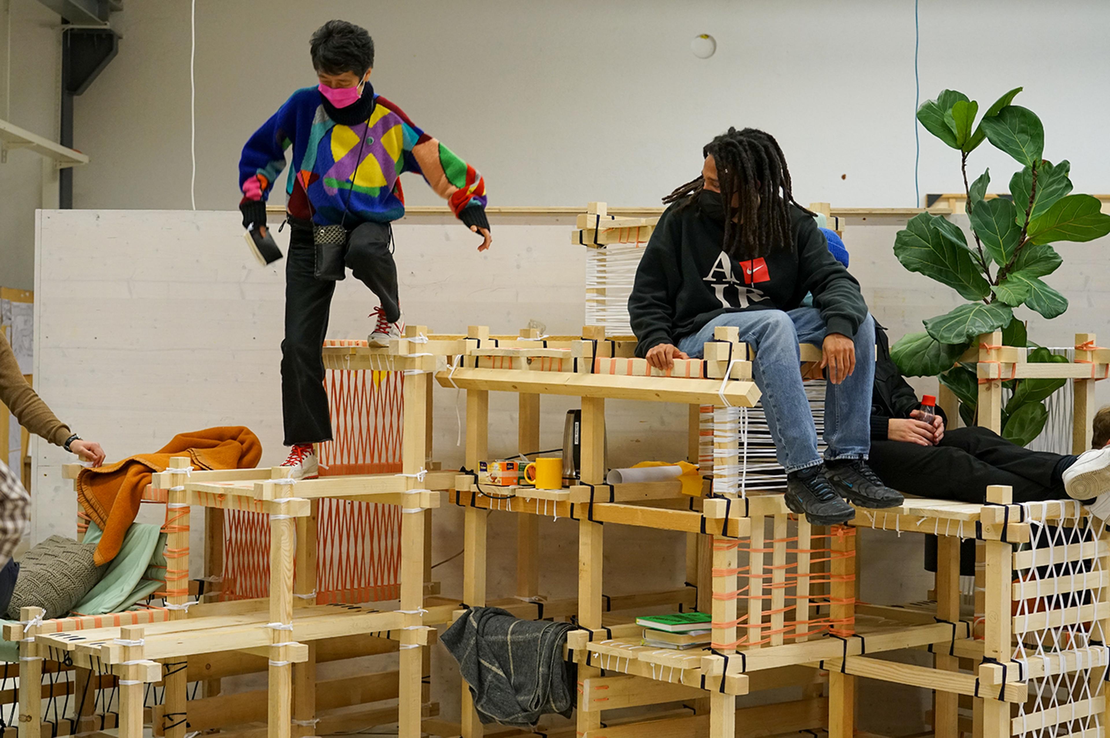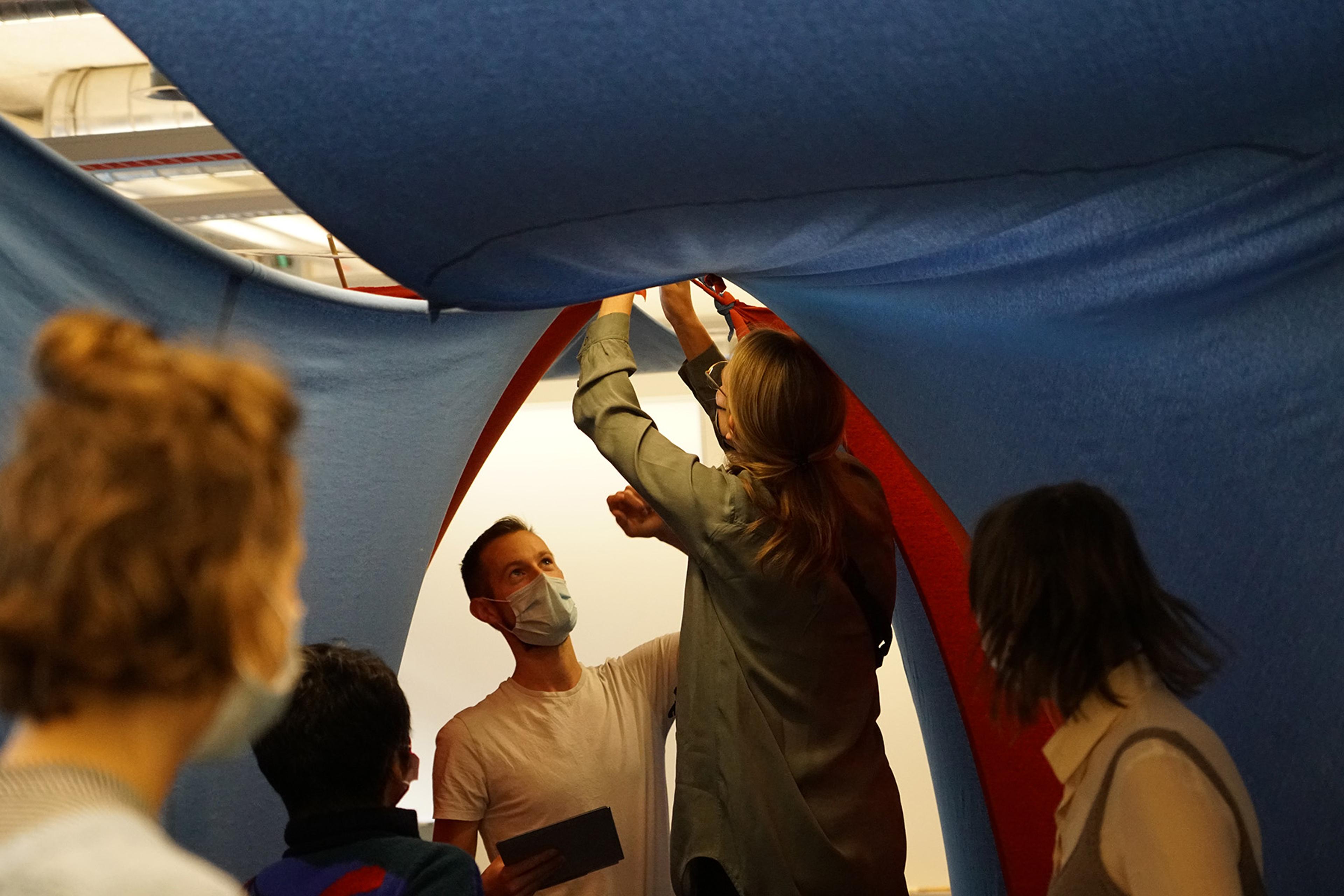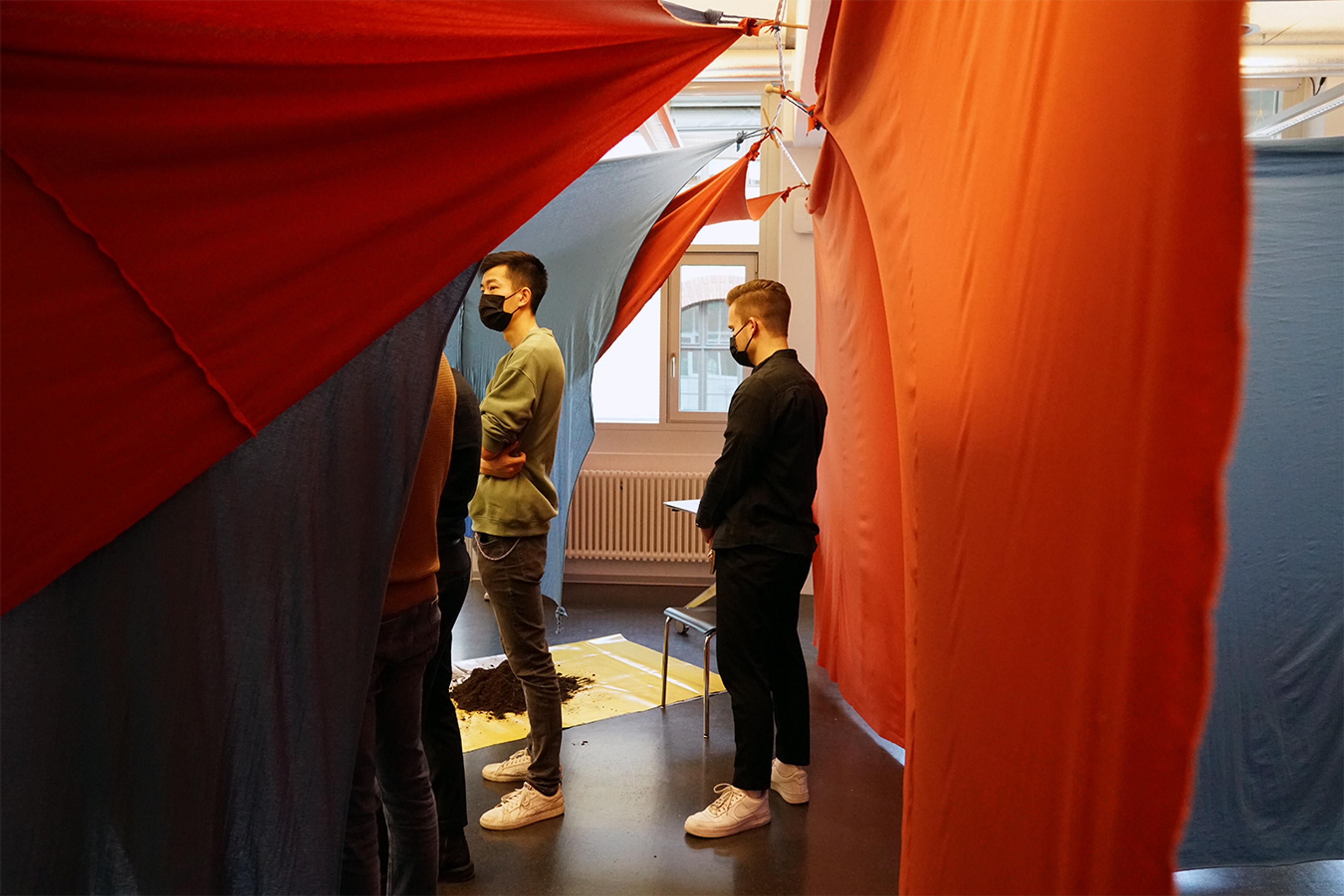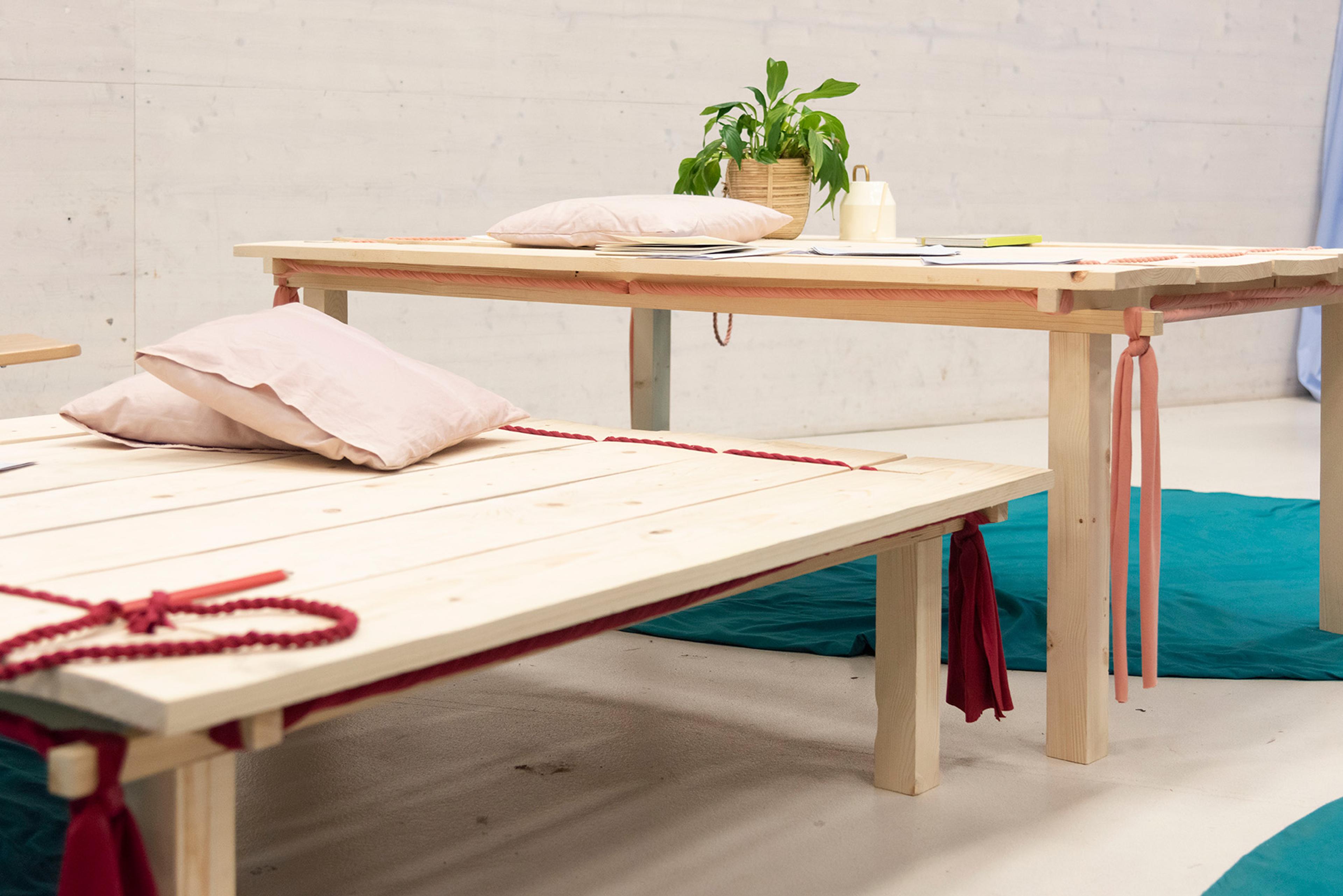 The second phase was about building spatial interventions in group work out of wood and textile. In contrast to the student’s habit of planning first and only later on making models for review and visualization purposes, the aim was to find comfort in not-knowing and to face potential failure by build “performative mock-ups”. Supported by carpenter Karl Rühle and textile designers Eric Chevalier, and Anne Masson, students started with simple and playful tasks to get acquainted with wood and textile: Meter-long surfaces were rolled out, pulled at all corners, twisted and knotted. Likewise, the handling of large logs and heavy equipment for woodwork provided everybody confidence and reliability amongst their peers. In combination, new solutions were found that were both statically performative and aesthetically pleasing. During that phase, laptops gave way to unfamiliar tools such as sewing machines, chopsticks and “spaghettis” (recycled long narrow scraps of fabric). One could observe how the energy continuously seemed to liberate students, beyond our studio alone, from an implicit code of conduct.