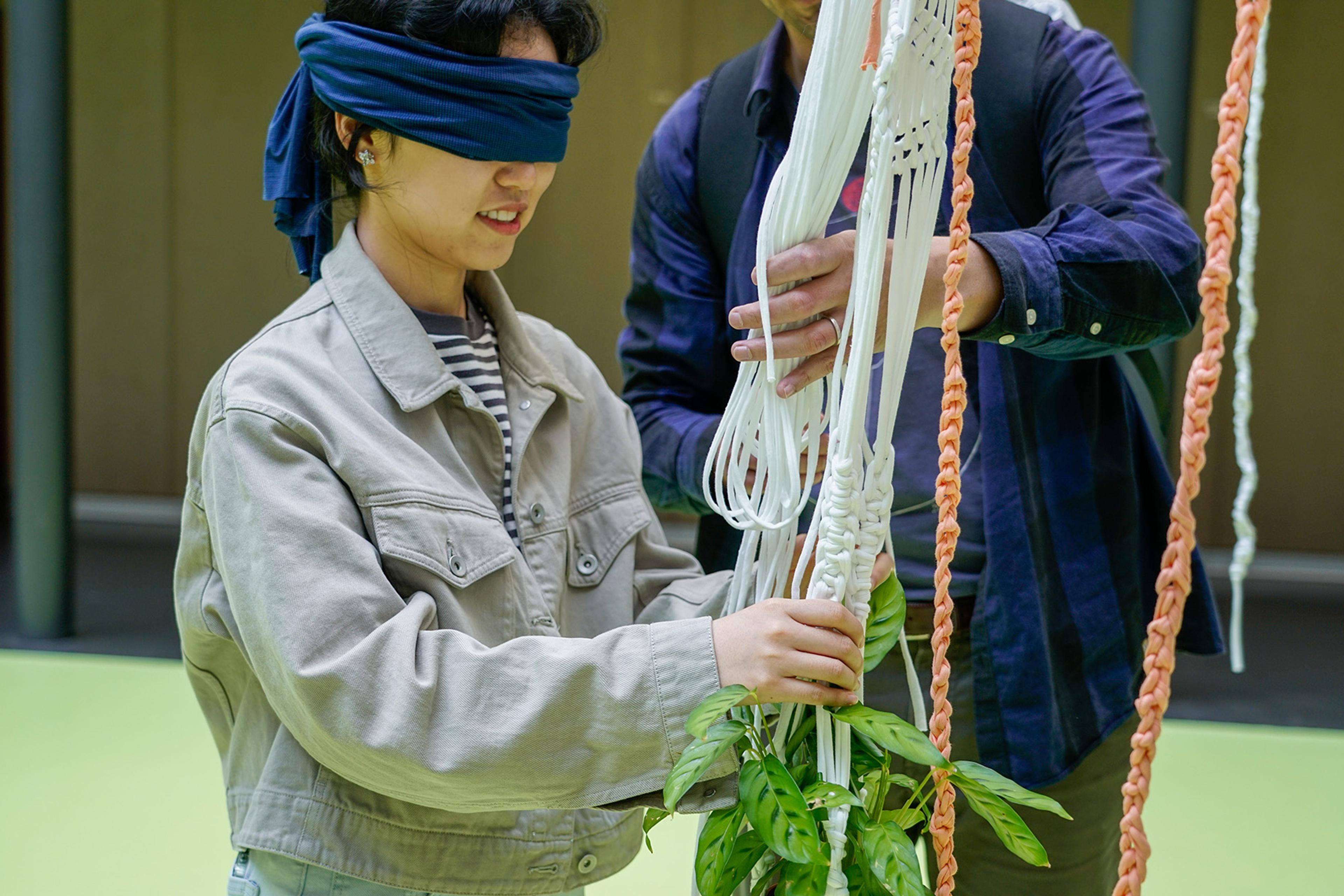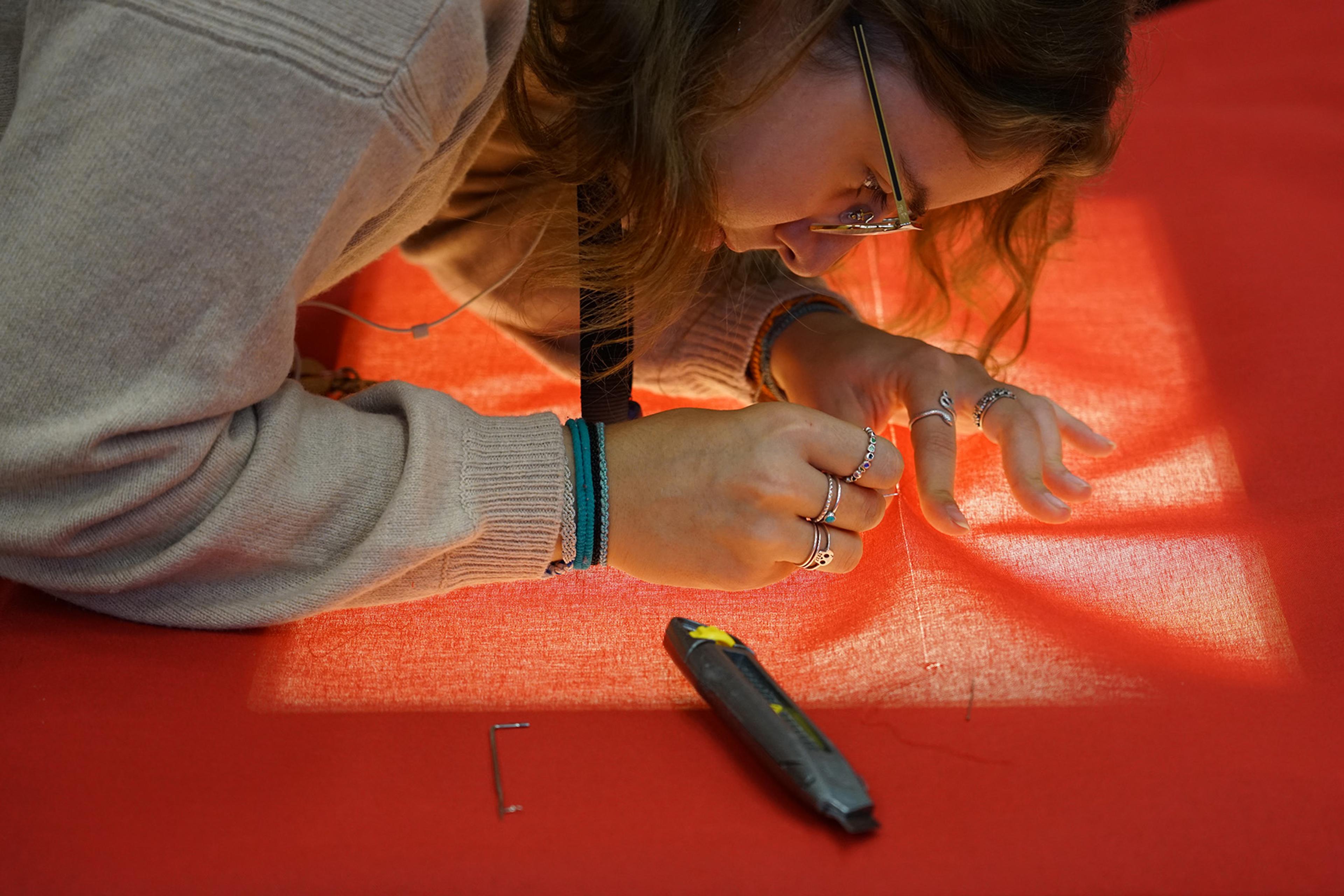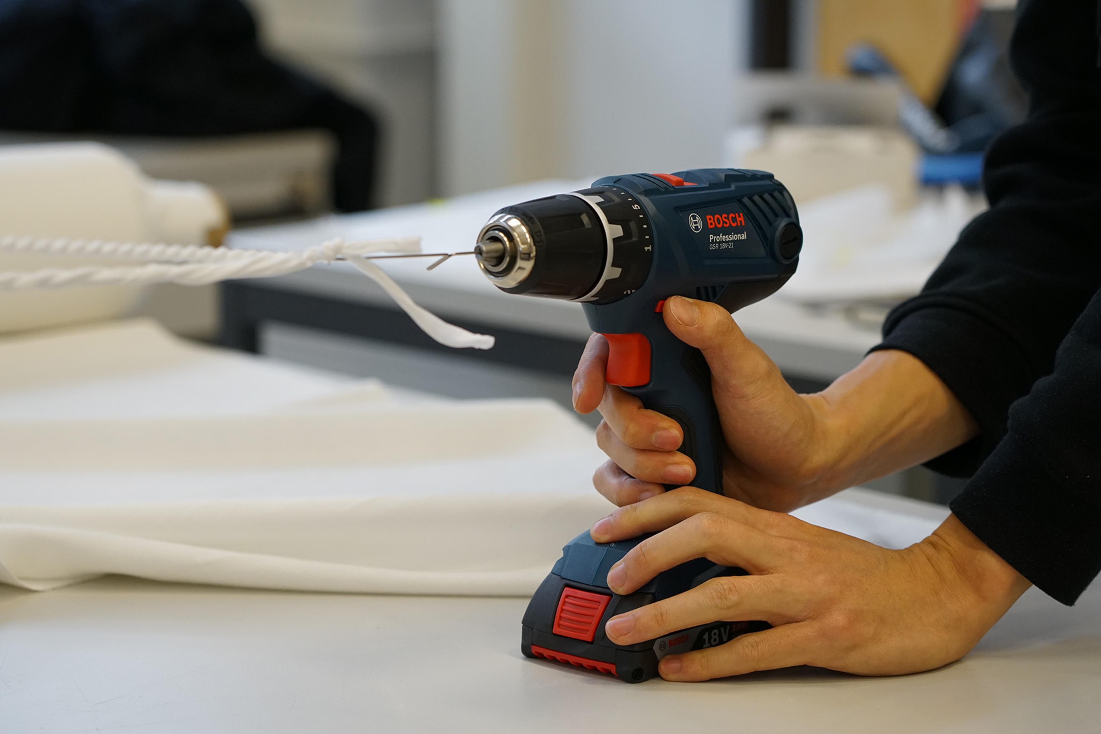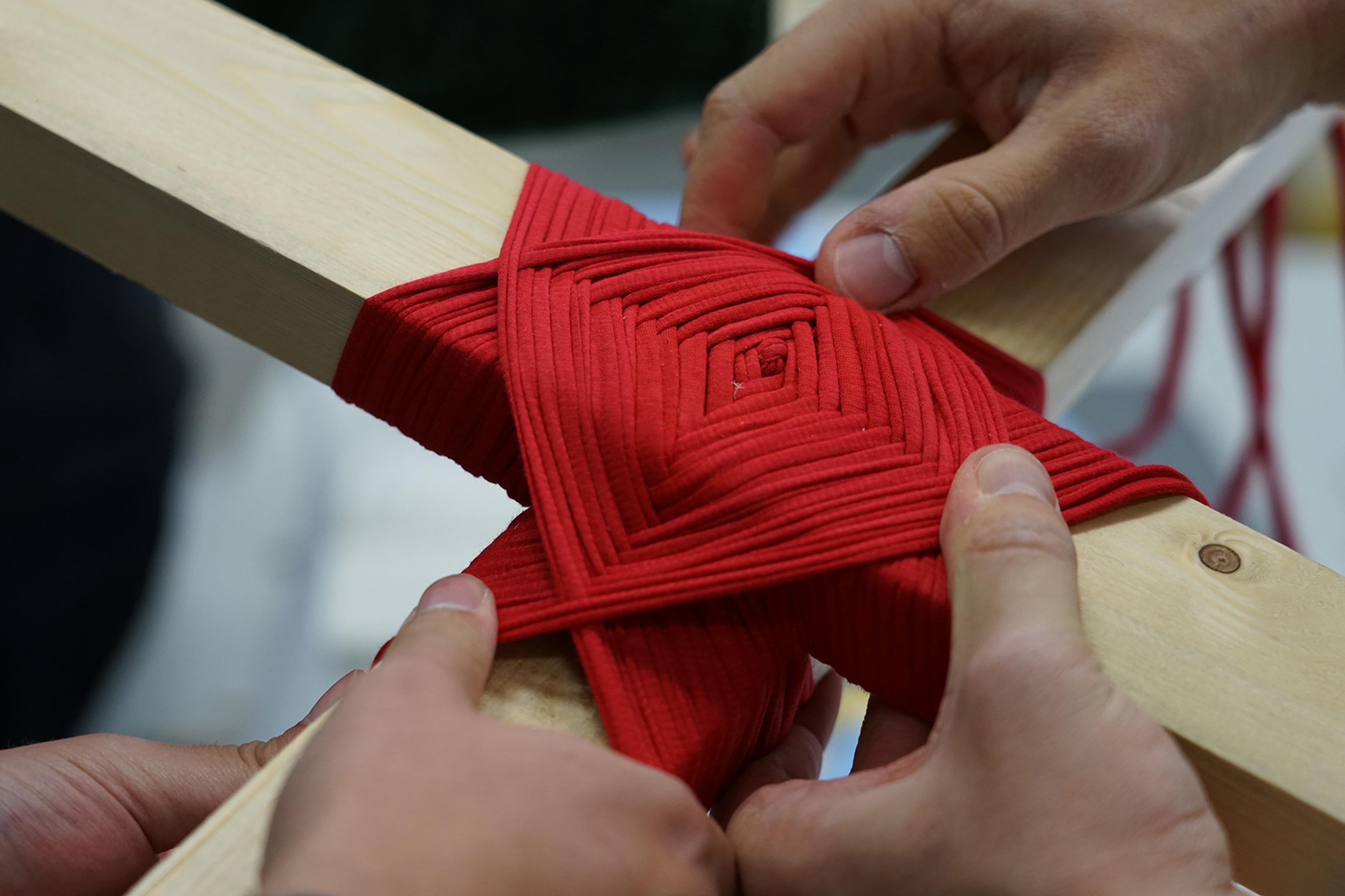 The second phase was about building spatial interventions in group work out of wood and textile. In contrast to the student’s habit of planning first and only later on making models for review and visualization purposes, the aim was to find comfort in not-knowing and to face potential failure by build “performative mock-ups”. Supported by carpenter Karl Rühle and textile designers Eric Chevalier, and Anne Masson, students started with simple and playful tasks to get acquainted with wood and textile: Meter-long surfaces were rolled out, pulled at all corners, twisted and knotted. Likewise, the handling of large logs and heavy equipment for woodwork provided everybody confidence and reliability amongst their peers. In combination, new solutions were found that were both statically performative and aesthetically pleasing. During that phase, laptops gave way to unfamiliar tools such as sewing machines, chopsticks and “spaghettis” (recycled long narrow scraps of fabric). One could observe how the energy continuously seemed to liberate students, beyond our studio alone, from an implicit code of conduct.