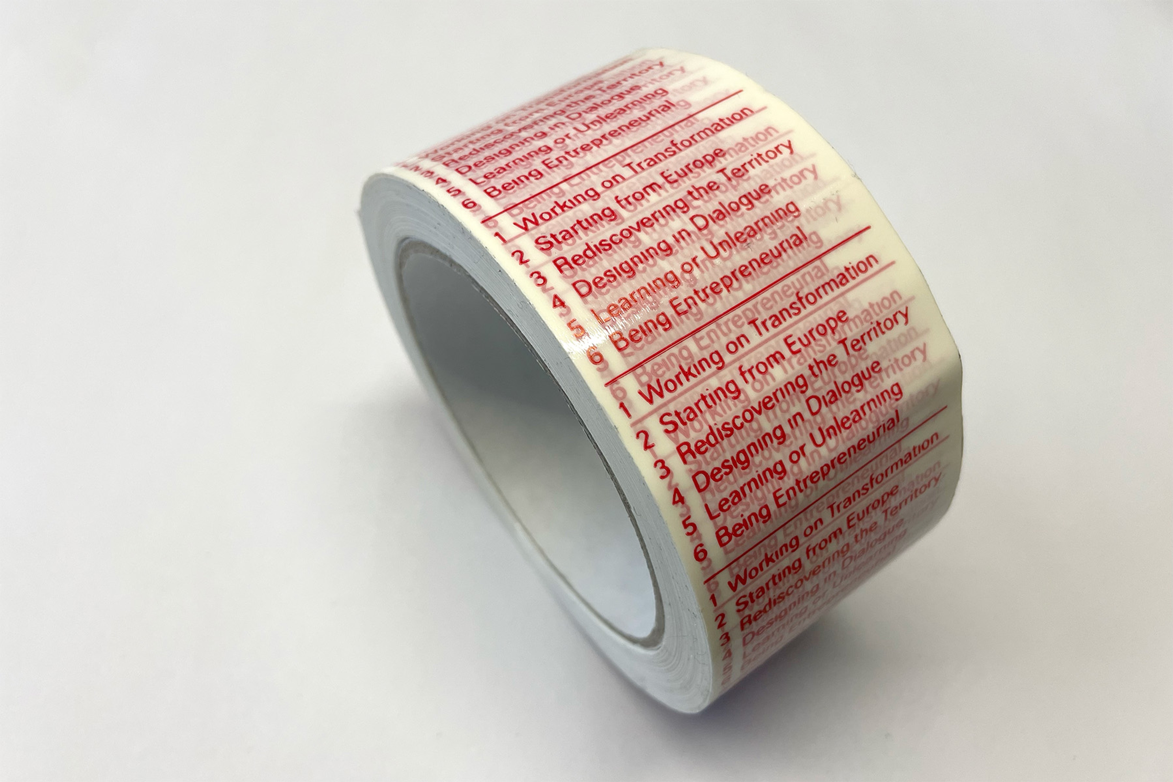 Tape comes in various sizes and colors, with different levels of adhesiveness – some highly sticky, others easily removable. On our NEWROPE Tape, 6 essential approaches of our chair can be found: Working on Transformation, Starting From Europe, Re-discovering the Territory, Designing in Dialogue, Learning or Unlearning, Being Entrepreneurial.