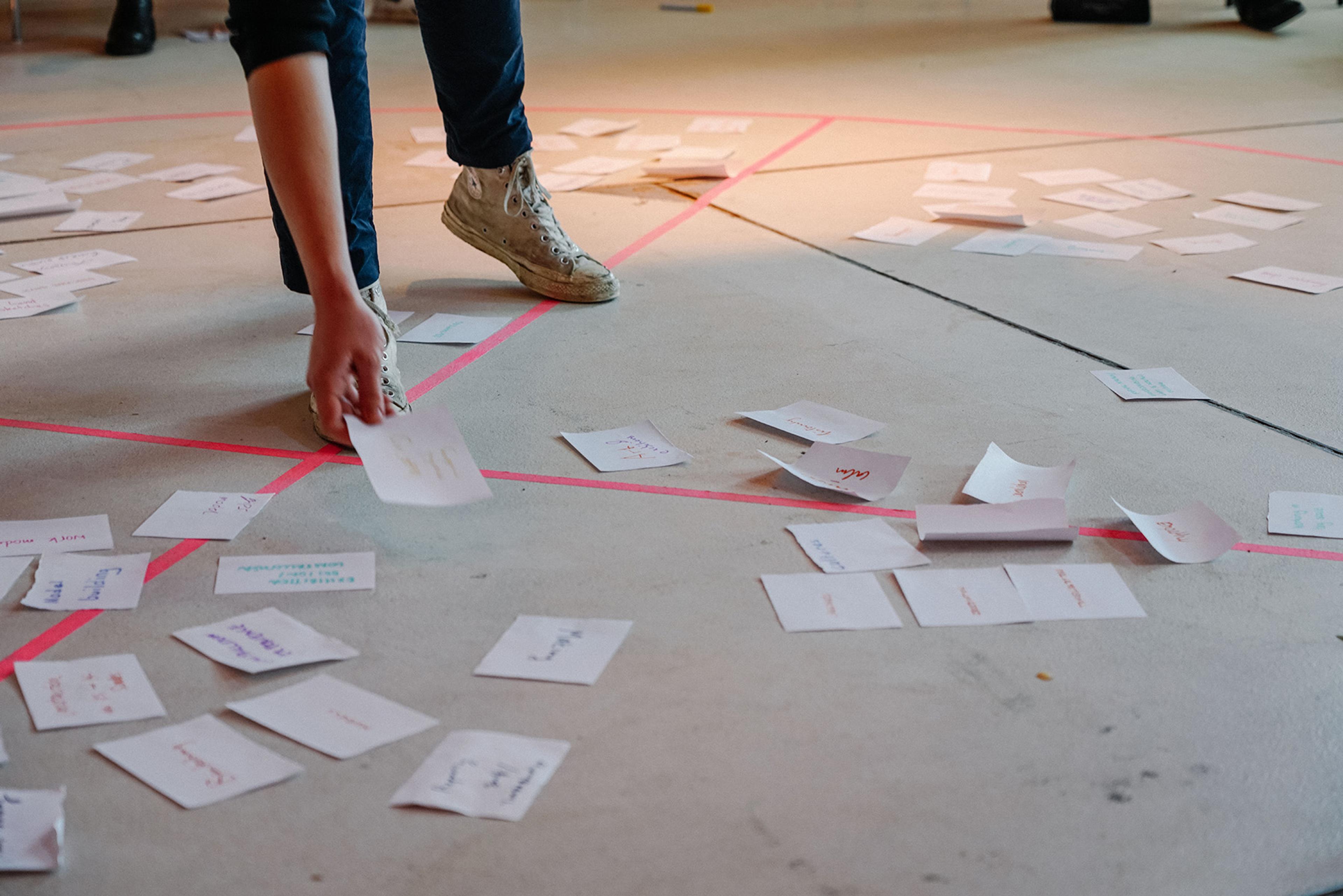 In the Design in Dialogue Lab, floor-marking tape and other simple adhesive materials transform floors and walls into dynamic surfaces – or blank canvases – for playful exercises. With tape, we can create lines and symbols that temporarily reorganize the space. Since floor markings often evoke instinctive associations with behavioral patterns, they naturally elicit responses from users, fostering engagement and exploration. For example, we created two intersecting reference lines that allowed students to position themselves spatially. By moving along the axes between two sets of poles and standing in a specific quadrant, they could visually express both their current and preferred stance as designers based on certain variables. In this case, the axes represented the scale at which they prefer to work (ranging from small to extra-large) and their approach to urban transformation (from practical to theoretical). In other contexts, tape can also be used to suggest specific uses and associated behavioral patterns – for instance, by marking out a sports field within a space, subtly guiding interactions and movement.
